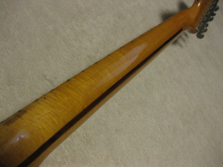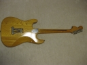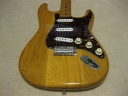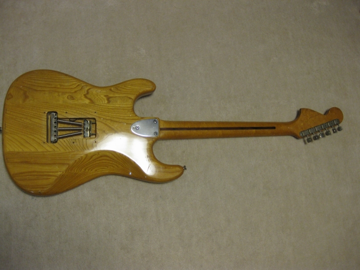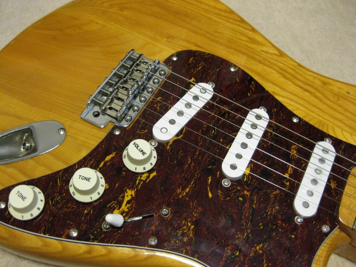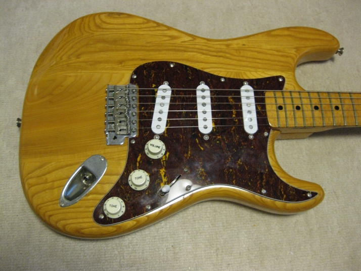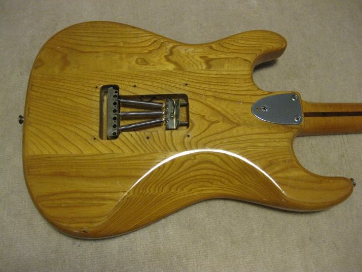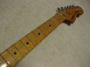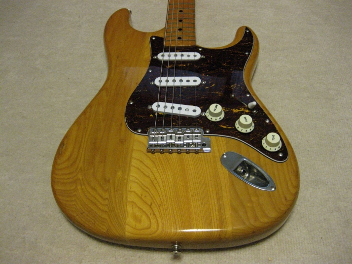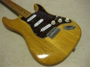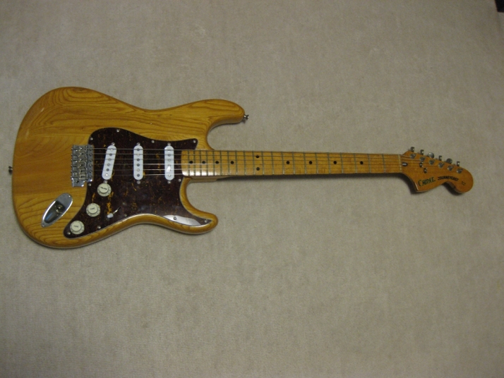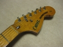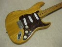 | Camel CSC-500N Chushin Gakki Made Stratocaster Camel Guitar, It is one of my favorite JV guitar. This is not perfect replica yet. But they use the good quality wood for the body and neck. What's not good point? The PU cavity is not like original Fender. Just like Yamaha Strat mode, have the PU cable cavity side of PU cavity (right). Many people like the original loos cavity. But I think this side cavity make also good tone. Anyway, when I get this guitar, the electric circuits are broken. So I have replaced most all electric parts and rebuilt some hardware too. 1) Pickgurad Mojotone Tortoise ST 2) Music-Trade Steel made Inertia Block (Can be used with Multi-Function Tremolo Unit) 3) Gotoh ST Classic Alpha X 3 4) Oak Grigsby 5 way switch 5) Switch Craft Out Put Jack 6) Scud Tremolo Spring 7) Aria Pro II Vintage Type Tuner (used) 8) Sprugue Orange Drop Capacitor 9) Cloth wire used, Output wire are Belden Silver coated Copper. Well, this guitar became a good condition guitar with good tone. The body probably Sen (Japanese Ash) but looks like American Ash. The weight is 3.72Kg. The neck is 1P maple with 41.85 mm width nut. The gip is standard C. The neck has a bit flamed pattern. I like it. The body has a bit dents and scratches but these are not really visible with natural finish body. Under Pick Guard, there are old screw holes (I fixed). Pretty Good tone. We will deliver this guitar with Gig bag. Well, please enjoy JV guitar! |