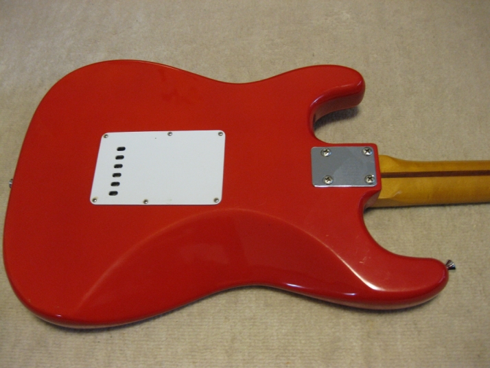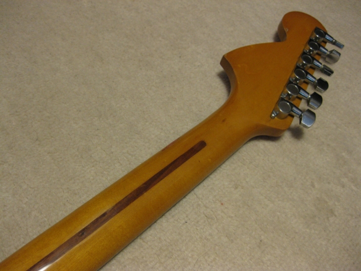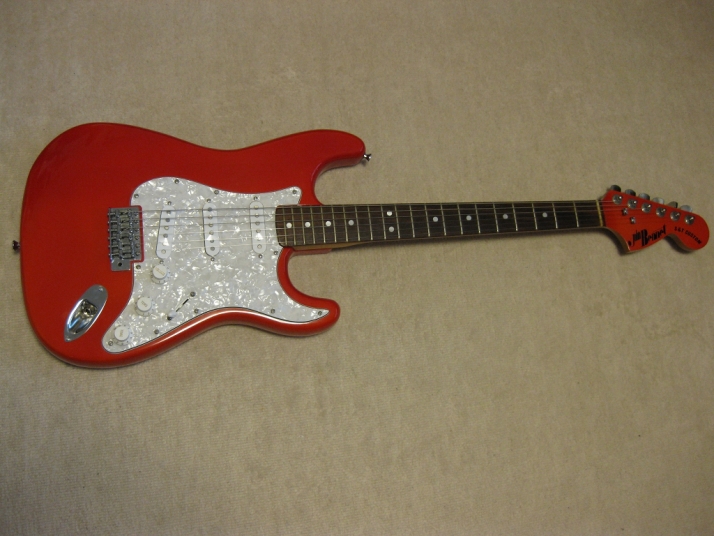 | John Bennett BST-600 Strat Matching Head About the John Benett guitar, you can see the detailed at Vintage guitar history area. I'm thinking this guitar was made by Kawai in 1975. Well, it is 35 years old guitar. It is very similar body construction with Fernandes. The hardware is same as Fernandes. I could see the different only the Pickups. When I get this guitar, the pick guard was cracked and the PUs are all broken. Therefore, I put the new electric circuits and Gotoh Classic Alpha ST pus. The switch is Oak Grigsby 5 way, the output jack is switchcraft made. I also changed all screws and springs around the bridge. These are all Stainless made now. The body is probably Sen. I think John Bennett is not Silver heart wood like Fernandes did. The weight is so light (3.63Kg). If it is silver heart, it should be over 4Kg. The neck is Maple with Red color matching head. The neck is like C grip with 40.7mm nut. It is very rare guitar. I have several John Bennett guitar. This is one of good one, I could offer you. We will deliver the Gig bag with this guitar. The Music-Trade original stainless made Tremolo arm will be delivered too. Well, please enjoy JV guitar !! |