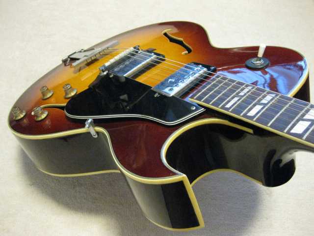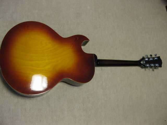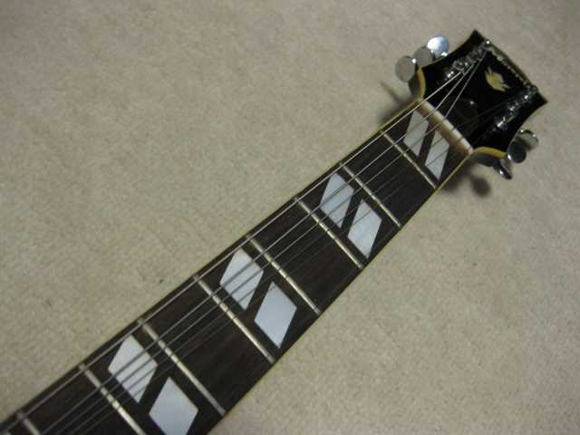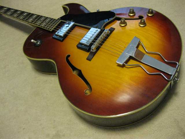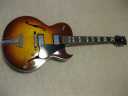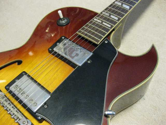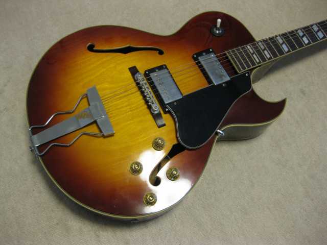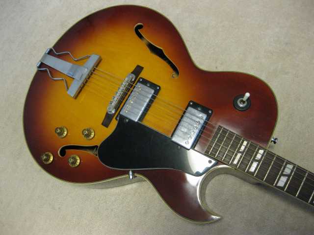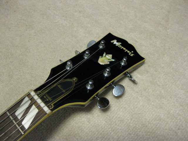 | Morris Yoshino 1971 Made MA-B ES-175D model Morris Gaitar is one of the brand name which Moridaira Musical instruments Co., Ltd is distributing. Moridaira was established in 1965. Morris guitar was established in 1967. As a guitar manufacturer and distributor, Morris was a bit late comer for the market. However, they did very good promotion specially for acoustic guitar and made their company foundation. This guitar is made by Yoshino Gakki in 1971. So, it is 40 years old guitar. Morris guitar was made by several sub-constructors such as Yoshino, Terada, even Fujigen made. Yoshino Gakki was originally Nagano Gakki. Nagono Gakki was separated to both Morris Gakki and Kurosawa early 70's. Well, therefore, this guitar is very early time Yoshino made Guitar. The good replica of ES-175D model. Compare with 1959 Gibson, the outlooks are very similar. The tuner and bridge are different from Gibson. But, generally it is cool. I'm not sure the body material. It should be laminated top. The neck is probably Maho 1P. The condition of this guitar is very good as 40 years old. Very regretfully, the neck PU is not working now. So, I have asked our staff to change PU, Pot and switch So, now tis guitar is good condition for playing (6th strings 5-6 fret buzz when low action set-up) I never play the original ES-175D. Therefore, I could not comment so much about the tone. I felt the resonance of body is good and warm tone ! |