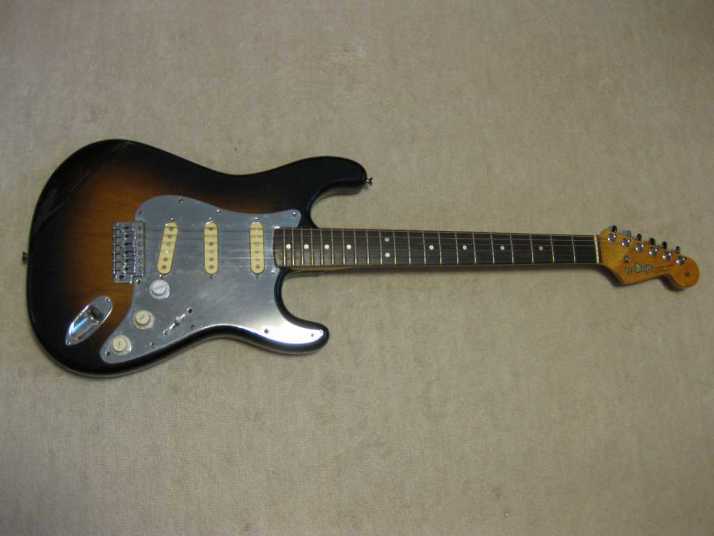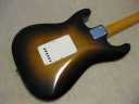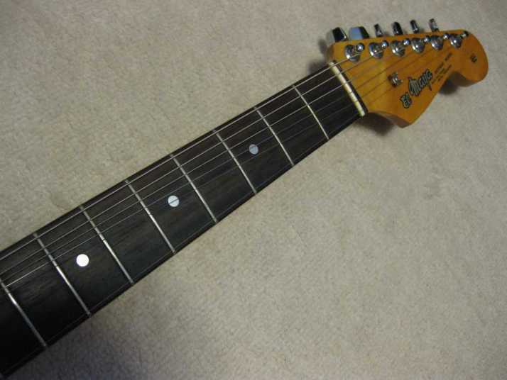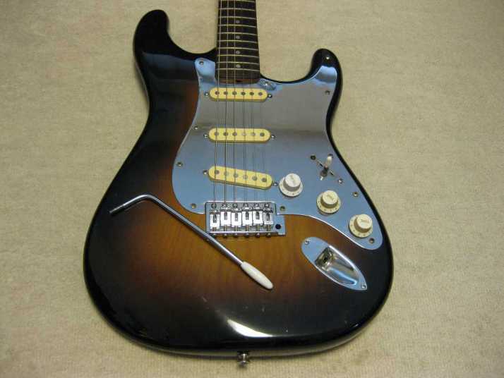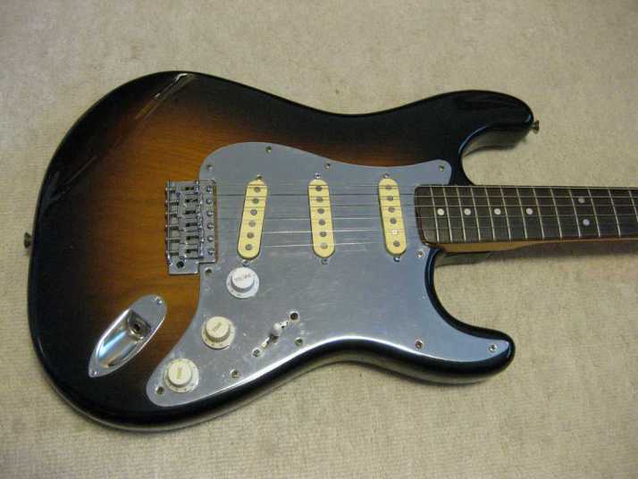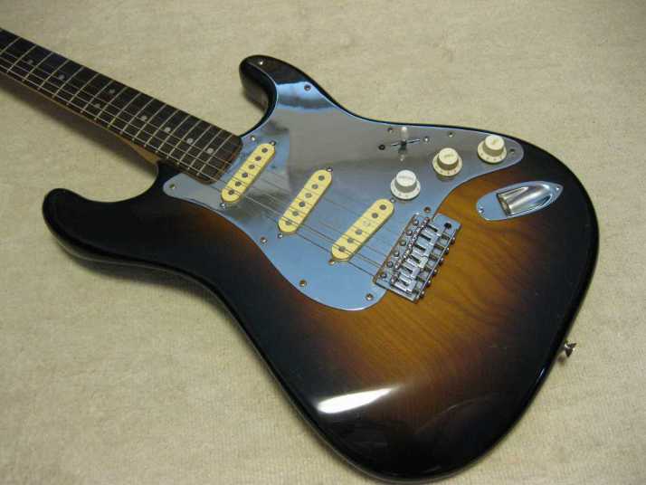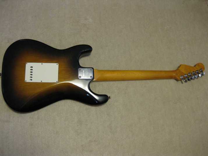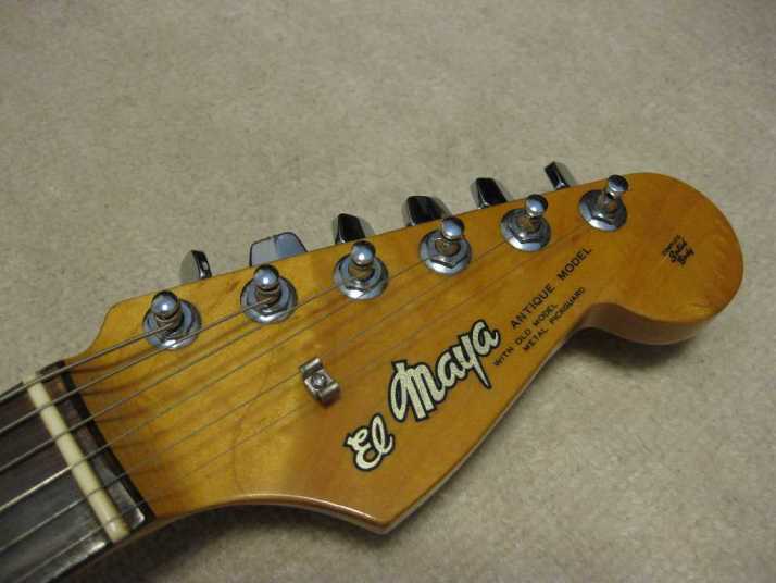 | EL Maya Metal Pick Guard Strat model This is El Maya Stratocaster Antique series top model. El Maya was distributed by Rokkoman which is leading distributor of Classic type accoustic. They offered the electric model 70's - 80's time. I guess, Rokkoman exported some of them as Maya brand. Maya is cost effective export model. Therefore, the material is completely different from original El Maya (Later, Rokkoman offered El Maya Jr. series here. I think this type is almost same specifications with Maya) This is fully original condition. I have only found out the previous use made the groove at the neck pocket end for truss rod adjusting (see picture). Beside this, this guitar is completely original guitar. Electric circuits are original too. The body should be Sen 2-3P with 3.8Kg. The neck is straight with 42.6mm width. It is pretty good condition. Really good looking as over 35 years old guitar. |