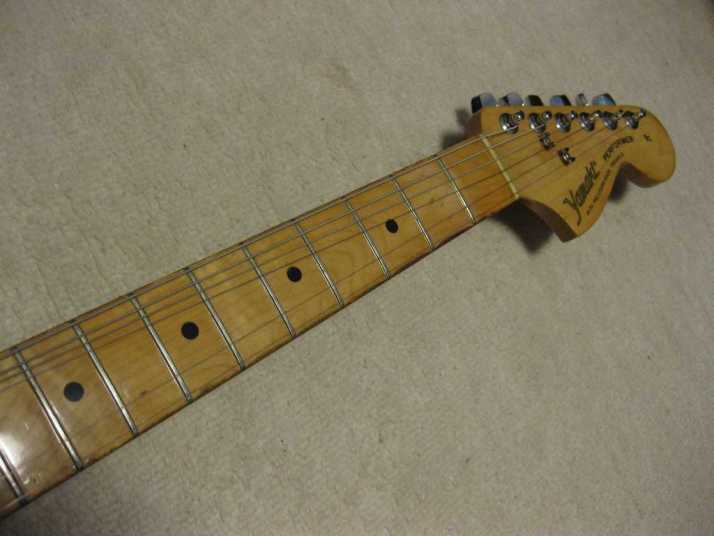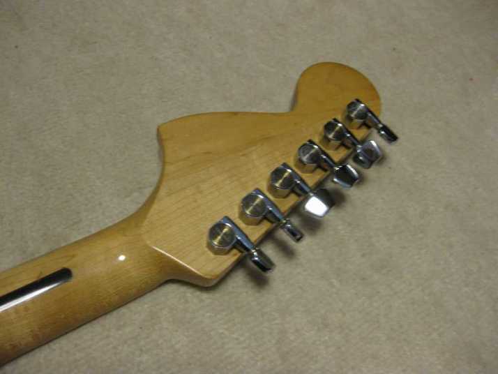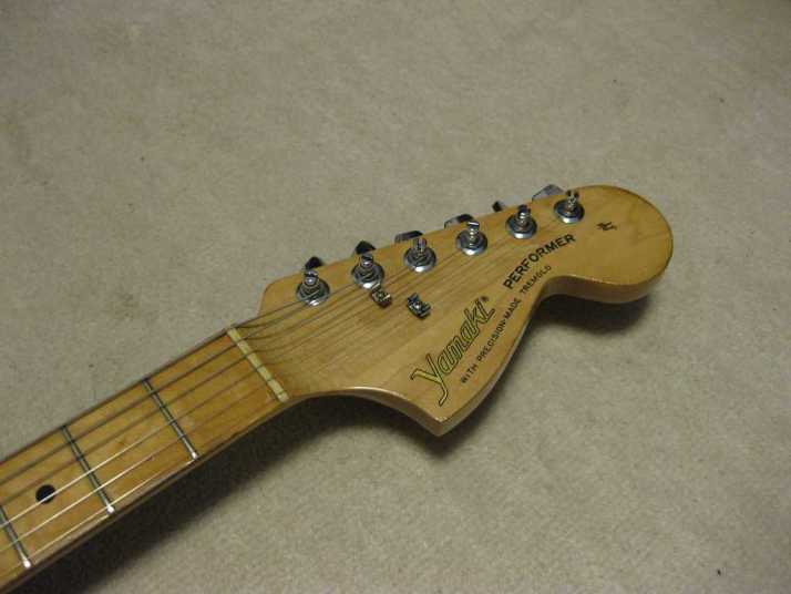 | Yamaki YST-450B/M ST72 model Yamaki is a famous acoustic guitar manufacturer. Many people here is looking for Yamaki made acoustic. The founder is Teradaira brothers. The elder brother managed the Dion Corporation which is distributing the Founder, Joodee and Yamaki. The younger brother was managing the Yamaki factory (Before establishing the Yamaki/Dion, they were working for Zen-On). This stratocaster model was maybe made in early 1980's or late 1970's. This guitar was made with great care. The condition of this guitar is proper.However, when I got this guitar, previous user changed the PUs. I could not specify the brand of PUs. So, I decided to change all electronics parts of this guitar. Now, the following parts are equipped on this guitar. Well, vintage body and brand new parts. 1) PU Gotoh ST Classic Alpha x 3 2) CTS Mojotone Pod X 3 3) Oak Gribsby 5 way selector 4) SBE Orange Drop 5) Belden Wire 6) Brand New SCAD Knob 7) All Stainless screws around Bridge units. 8) Pickguard It is over 25 years old guitar, so the outlook is not like brand new, has many scratches and dents. However, as you can see, they are not serious damage. The body is probably SEN 2-3P. The neck is 1P but the head is 2P. It is soft V grip type. On the neck set plate, there is a hole said "Epochal Rod System". Maybe from this hole, we could adjust the truss-rod. It said patented. I personally think Yamaki is one of good JV guitar compare with other brand. Good era's great guitar ! |