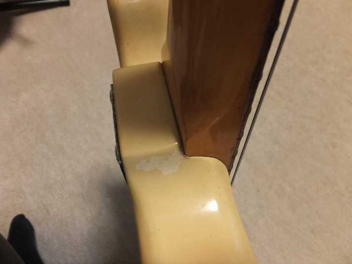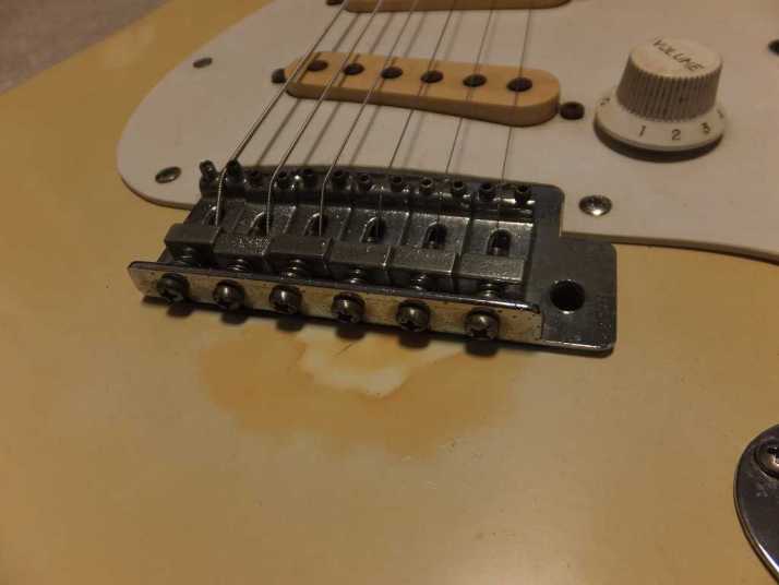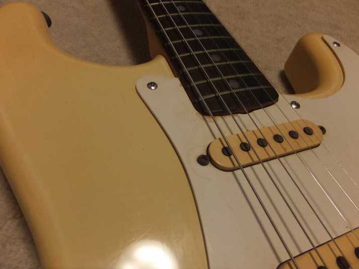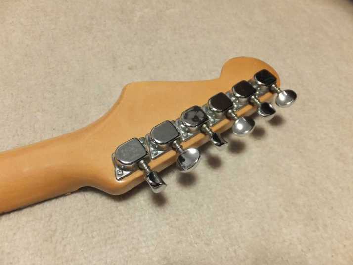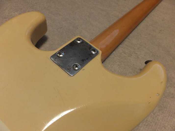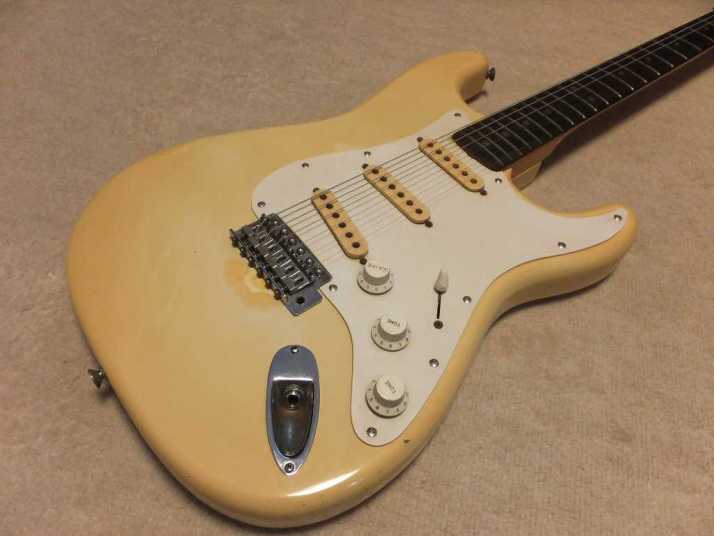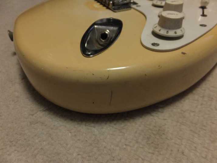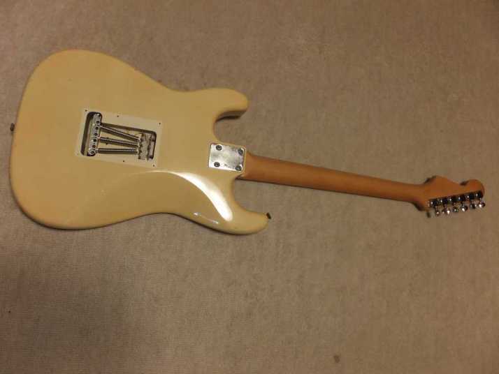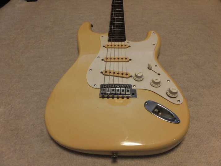 | Orange Stratocaster 62 ? model 1977 Made This is very rare brand. I have heard that one of Osaka music store made a marketing plan to sell This OEM guitar with Fernandes or Kawai. Probably, they didn't satisfy the replica of Fernandes. Probably this is before Stone Logo FST (tokai made) era. I have check the body construction. It is very similar with Fernandes FTS-70 series. The difference from old Fernandes is the neck finger board. Orange is 1P maple neck. Well, Fernandes 76/77 made FST series have the 1P neck for short period. I had a few, but the specifications are much closed to Tokai made stone logo type. From the catalog information, there were small head (62 model) and large head (68 model), This is large head type like 62 model. But it has the 2 strings guide. Currently 1 strings guide on. Under the bridge, there are color changed. The body is probably Sen with 4.18Kg. The neck is Maple 1P, C shaped grip, with 40.8 mm Nut width. This is original parts on. The body inside has a bit crack because of age. I have put the wooden bond. Under the bridge, there are color changed. The neck is not really straight, well, still can play. For this point, I offered lower price than proper conditioned one. |