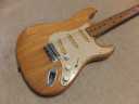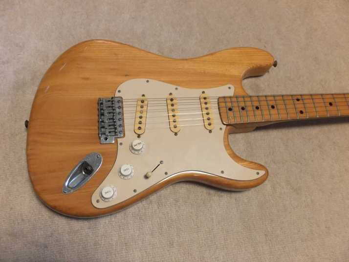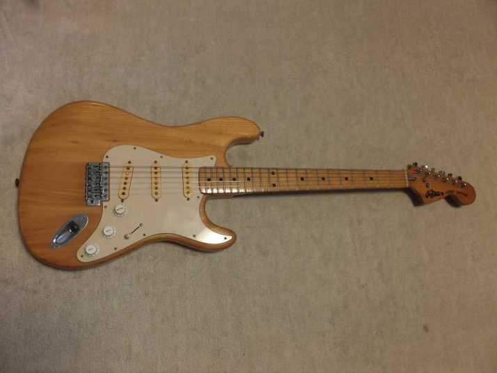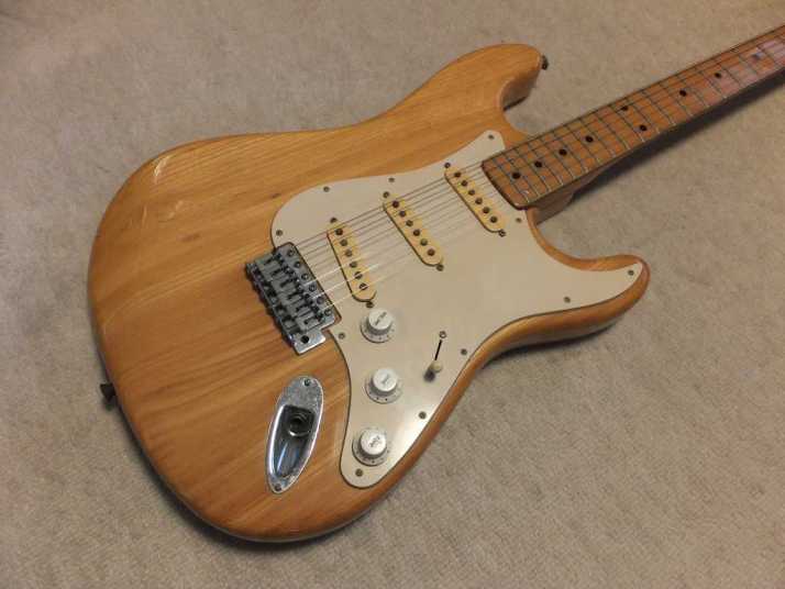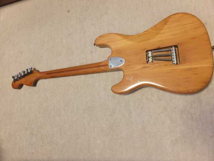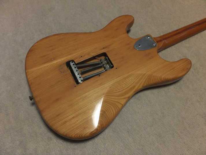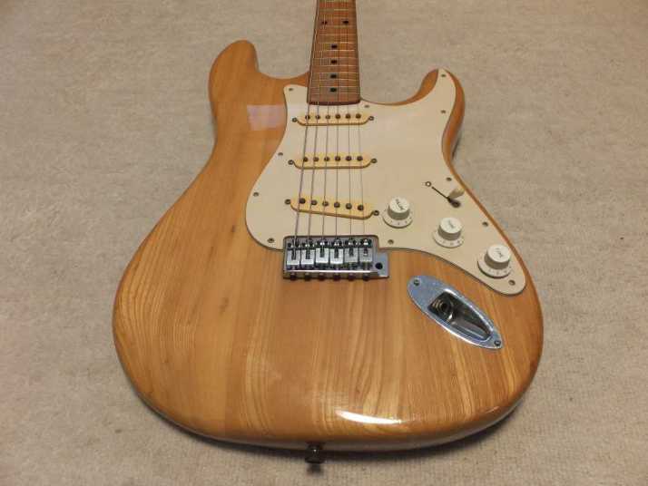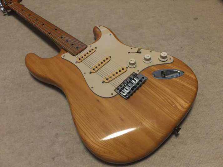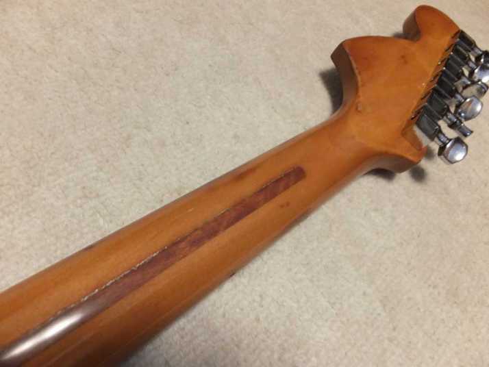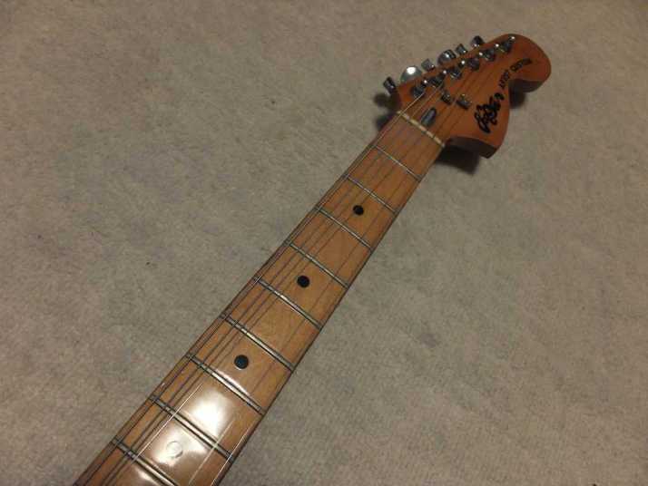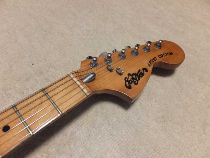 | Joodee 1978-80 made Stratocaster model I collect several Joodee guitars as collection. I would say this is not really good replica such as Tokai or Fernandes Revival. However, it took me a dreaming of 70's time. Joddee were made by Dyna and Yamaki. This is early Joodee which made by Dyna Gakki. You guys knew this MFG well as a OEM manufacturer of Fender Japan now. Most of Joodee are not really good condition now. Well, this guitar looks no really beautiful. However, generally O.K. for playing. The body is probably Sen. The weight is 3.58Kg. The neck is maple with 41.3 mm width. The frets are fair condtion. The neck is a bit thick C grip (between U and C). The neck edge became not good looking, like old guitar. Well, this is old guitar, anyway. Beisde the skank line, both rose line wood and paint hves been a bit shrinking. Therefore, you could feel it a bit. The guitar will be shipped with used Gigbag. Well, try Japanese JV guitars!!! |