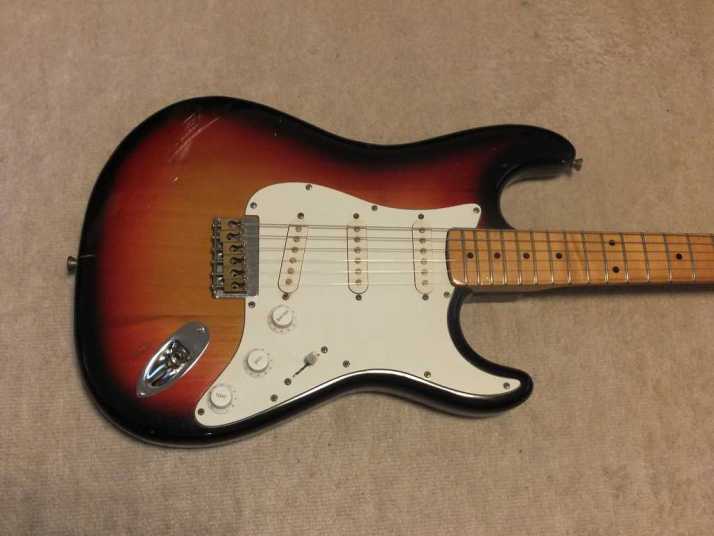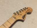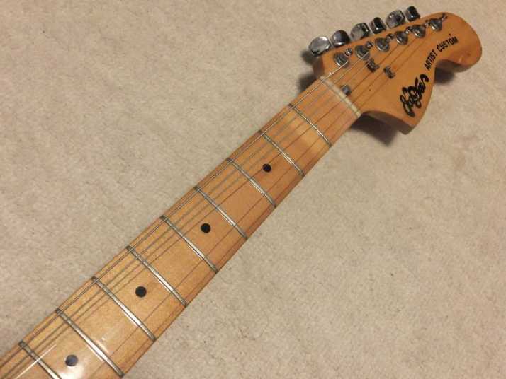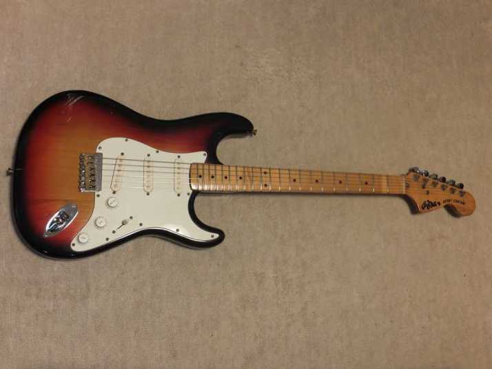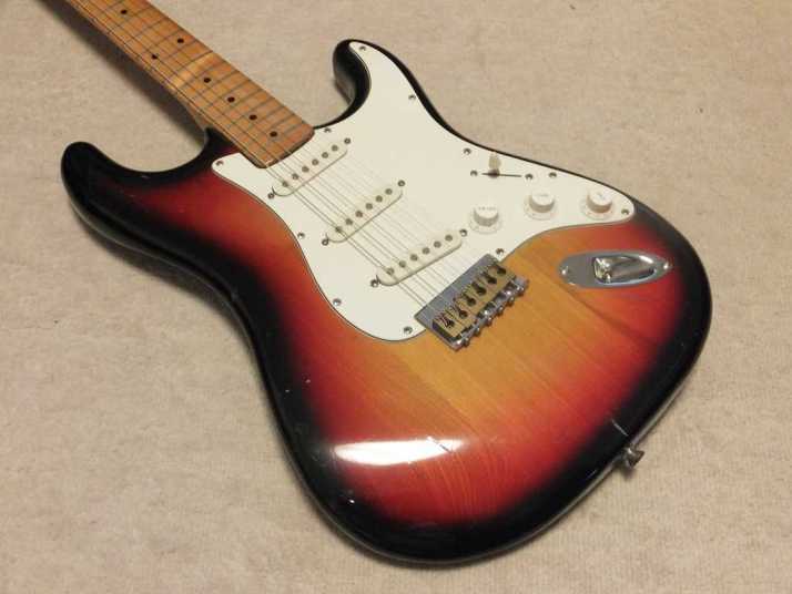 | Joodee Stratocaster 68 or 72 Model The Manufacturer name should be Dyna Gakki. They are currently producing Fender Japan with Tokai Gakki. Daion is distributing Joodee, so we thought Yamaki made this guitar. When Daion started the Joodee brand, they use Dyna as sub-constructor. There are some possibilities that early Joddee was made by Dyna, later model was made by Yamaki... Joodee has 2 logo design, anyway. This guitar is very rare with hard tail bridge. Only Bridge saddles were changed to brass made by previous user. The neck is maple 1P Body is probably Sen 3P. The nut width is 41mm and body weight is 3.55Kg. It is standard specification as Strat Model. It is pretty good tone as start replica. If you like to collect the 70's JV, this should be first one for you. Good era's great guitar ! |