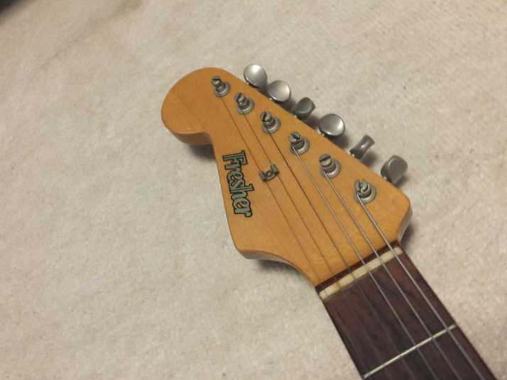 | Fresher Stratocaster 4th Generation Lefty Model This is 4th generation Fresher made by Chushin Gakki. In 1980, Kyowa shokai shifted the supplier to Chushin Gakki completely. As a replica, this Logo time guitar is closed to the original Fender guitars. Kyowa shokai was still targeting the middle class users. Therefore, this guitar was sold cheaper than Greco, Fernandes and Tokai. But absolutely better than Mail-order Guitars. Well, this guitar is really good sound. Personally, I recommend you this guitar. Better than FJ ? It is very hard to comment. Just I could tell you that this is better than your expectation. This is very rare Lefty model. I didn't change any for this guitar. The body is probably Ash 3-4P with 3.71Kg weight. The neck is Maple 1P (head area 2P) with RFB. They save the cost using 2P neck. The nut width is 42.7mm. The neck is fine, of course, truss rod is working. PU is ferrite type single. If we put the Alnico type, we could better tone. The nut has been changed by previous owner. I think this is Tusk nut. The outlook of this guitar is not really good. Many dents and scratches. It is pretty good quality replica. You could enjoy this guitar well as F Killer. The guitar will be shipped with Gigbag (not original used) Additional Info. : Kyowa Shoka was bankrupted in May, 2011. No more Frehser guitars even new products. |