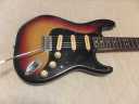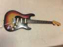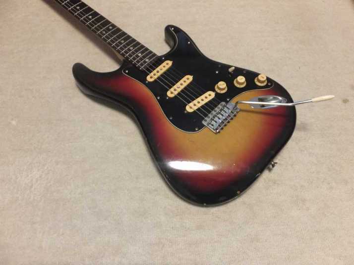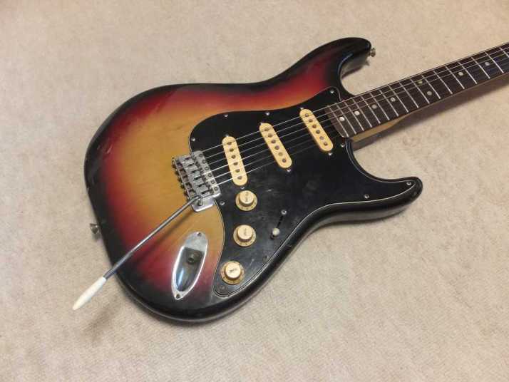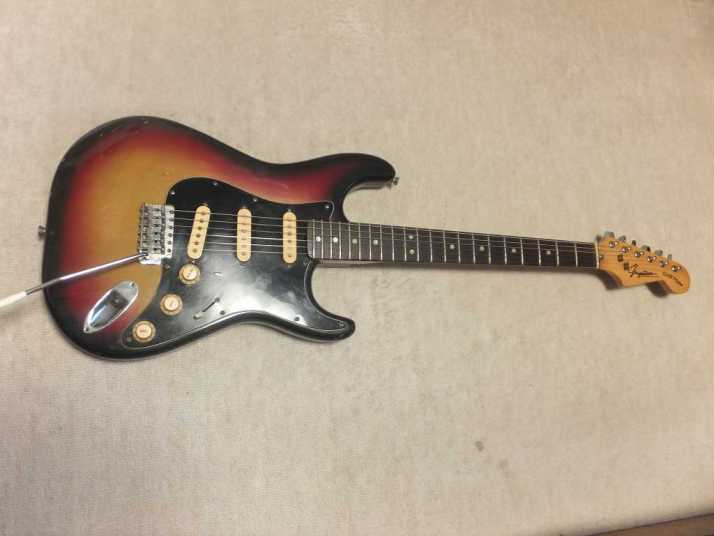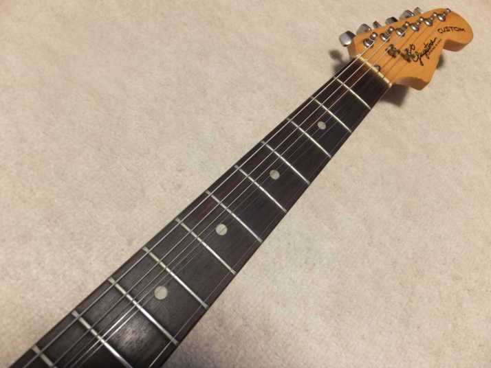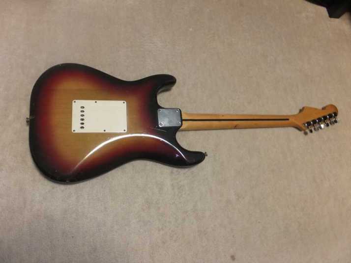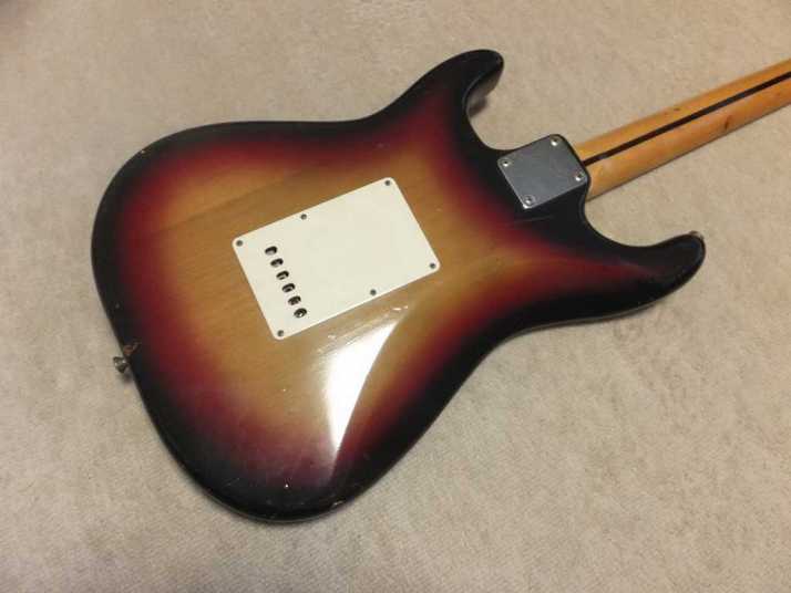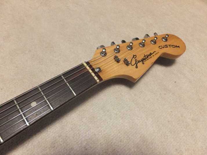 | Guyatone Stratcaster Replica 70's made I have a strong impression for Guyatone products. In 1970's. Guyatone was one of leading guitar and amplifier manufacturer here. They were established as a furniture manufacturer. In Japanese, Furniture company is "KAGUYA". They made the Brand name as Guya...and later they said Guyatone. They started the guitar manufacturing in 1960's. When I started to play the guitar, Guyatone became like amplifier manufacturer. Well, they still made several guitars. But these were not popular except Rory Gallagher model. They were also main suppler of effector pedal such as BOSS that time. I remember I use their over drive. This Guyatone strat replica is not better than early production. Maybe, late 70's made. I never seen the small head type Guyatone strat before. But they made it. The neck is O.K. and truss rod is workable. It is 1P with Rose FB with 40.8mm width nut. The truss rod adjustment is located around nut with bullet type. It is funny but they didn't mixed the specification of vintage and 70S strat. I'm not sure the body material. It seems to be solid wood but it is very light only 3.09 Kg weight. Guyatone was bankrupted this Year Jan. They just ended their long history. I suppose that many old guitar g\fan missed it. Nowadays, young generation didn't pay attention for Guyatone guitars. They didn't know it. However, this brand was one of historic guitar, no doubt. |