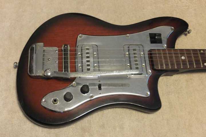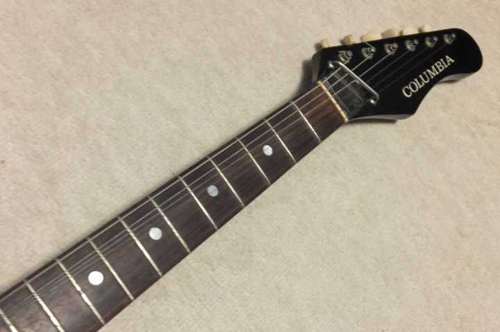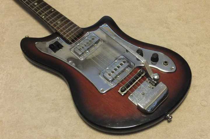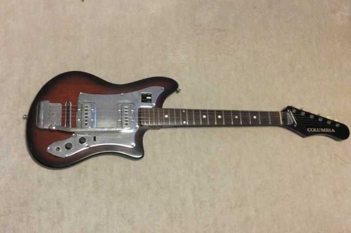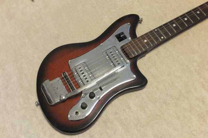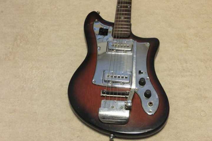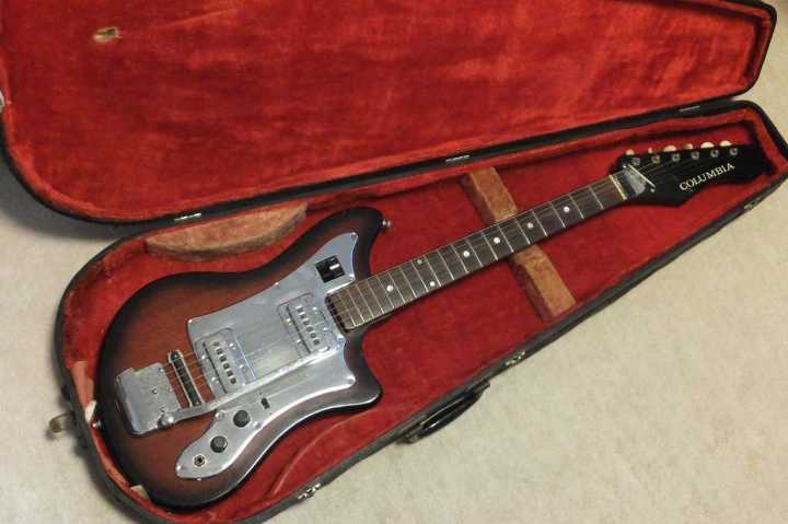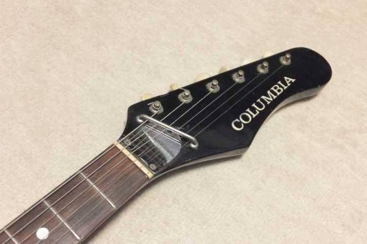 | Columbia Guitar 60's Matsumoku made w/hard case I'm not sure about 60's made guitar. After I got first Columbia guitar, I found out this is CSG-631. This guitar was made in 1964-1966, by Matsumoku. Columbia is not guitar manufacturer. As you can see, they are the record manufacturer. However, in 60's, there are not so many music stores specially for the guitars. Mid 60's, The Ventures made a big booming here. Well, Yamaha, Kawai, Teisco, Guyatone and other manufacturers made the electric guitars and got a huge sales. I can remember that the electric shops and record shops offered those guitars. Well, you could imagine why Columbia started their brand. They just thought easy sales. Japanese Victor also offered their brand electric guitar that time. I bought this guitar not really on purpose. I have got several Teisco and Yamaha 60's model. So, I felt just compare this guitar with others. Well, I didn't expect great tone from this guitar. However, this guitar made me very happy. It is good clean tone. If you will play the blues, this guitar absolutely give you a comfortable tone. No idea about the body and neck material. It is not Mahogany and other good quality wood. However, it is quite good. The body weight is only 3.09Kg The nut is 44 mm. I feel the neck is a bit fat (approx 630mm scale). Generally, this guitar is fine. Currently, the tone is not working. PU selector is fine. But the small selector switch is not working (I'm not sure what is it). If you are looking for 60's JV, this is really good guitar. We are going to send this guitar with original hard case (not good condition, but still can be used). Enjoy old days JV guitar! |