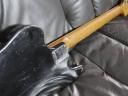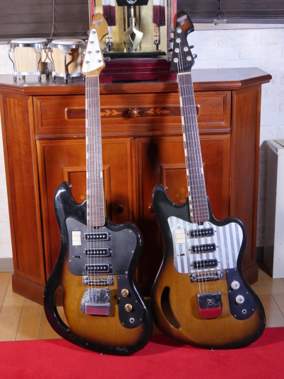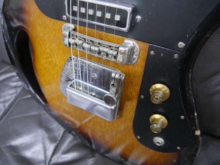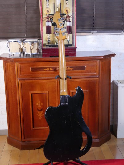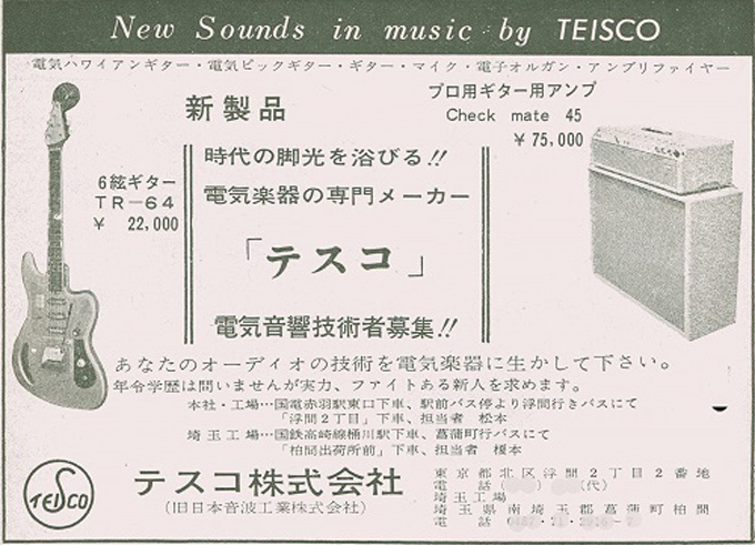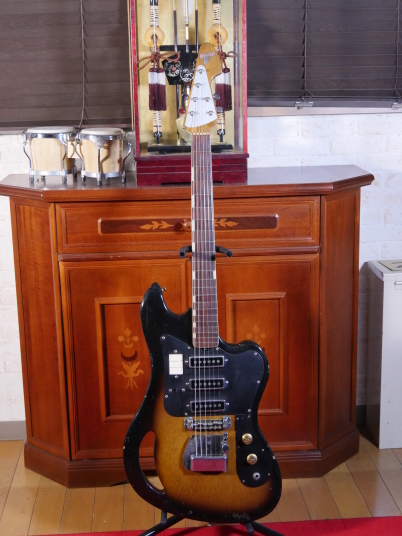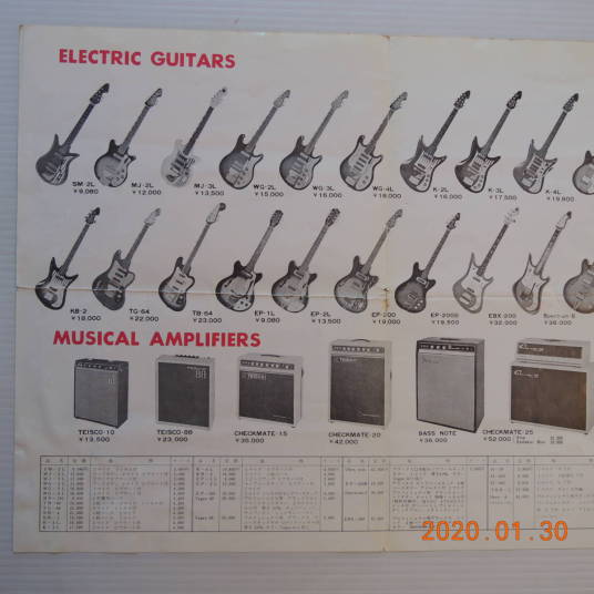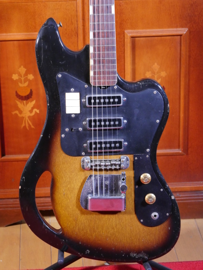 | TEISCO TG The 1960s were a childhood for me, my family added TVs, washing machines, telephones, record players, microwave ovens, etc. one by one that time. I remember watching the Olympics on TV. There was a student movement, but it was an era of high economic growth. The export value, which was 4,055 Million US $ in 1960, became 20,000 Million US $ in 1970. Economic margins make many cultures bloom. Outside of Japan, it was the time of the Vietnam War, but the momentum of the war was increasing in the United States. It made Hippies, psychedelic rock is born in music. The Japanese musical instrument industry sales were increased by Hawaiian music booming and later Ventures music. The economy development made many young people could easily pick up the guitars at home. The Japanese musical instrument industry such as TEISCO, GUYATONE and other were growing significantly during this period. Tesco was actually founded in 1946 and initially manufactured steel guitars and amplifiers for Hawaiian music. The production of electric guitars also started in 1952, and will lead the electric boom in the 1960s. Since the distribution of musical instruments was almost the same as record sales, record companies and audio companies also Started selling guitars. Musical instrument makers have also started exporting, helped by the booming overseas economy. I have heard many young American soldiers who stayed in Japan bought the guitars during the Vietnam War. Probably it was proper price toys for them. The TG series guitar was born in the year of the Tokyo Olympics. Perhaps it was influenced by FENDER JAGUAR released in 1962, I felt. There is a hole called Monkey Grip. Is it for balance or is it easier to hold by hand? It's unclear if it's just a design, but it's a unique design. I got this RG many years ago. I beleive it is TG-64, but the pickguard and tremolo unit is different from original. Some people pointed out this is TG-65. NO idea... I could not find out TG-65 on Teisco catalog. The neck is a bit FAT compare with Fender guitars. Generally, the neck of Japanese electric guitars around this time is thick. It's too thick for me with small hands.It is not really a good guitar, compare with the current technical standards. However, such a point makes me feel nostalgic. PICK UP is also a single type and very clean tone. Is the metal pick-guard made for Noise protection? Or just cost effectiveness? Anyway, it works as noise countermeasure. Interesting is the tremolo unit, which is well thought out as a cavity-less, mounting-only method. Probably, these constructions were influenced by Bigsby unit. Obviously, simple construction and mounting method are mass production essential. Well, Teisco TG is a historical model of the Japanese guitar industry. |