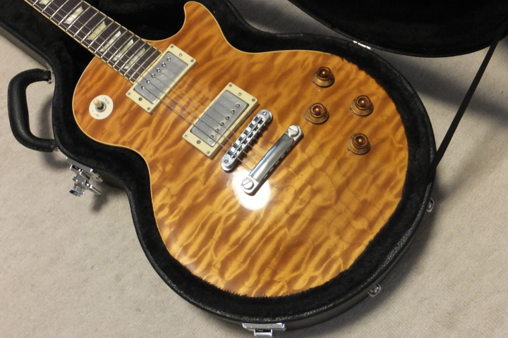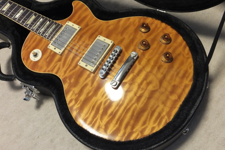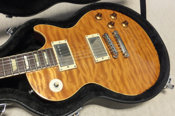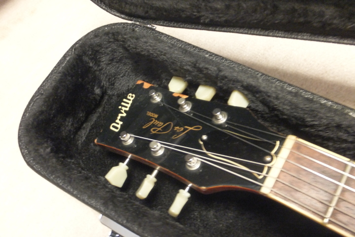 | Orville Les Paul Standard LPS-80(or 85) F model It is getting tough to find out good condition Orville MIJ guitar. Like G serial and numeric serial are getting more expensive. We could see Korean made K sticker Orville. However, MIJ Orville is completely different quality. (Many people said K serial is MIJ, but when you check the body construction compare with Terada/Fujigen made, you may be disappointed.) This is MIJ Les Paul Standard is made by Fujigen in 1996. It is beautiful flame top. Please note that this is first photo flamed top from Orville. It has the deep joint set neck constructions. The neck is straight, Truss-Rod is workable, Frets are fine (bit worn, because of used) and electric circuit is fine too. The grip of neck is pretty standard, not fat or thin. Well this guitar has many dents and scratches. Specially, body back, there are many small dents. So, if you like really good condition, this is not. This is really aged guitar. The body weight is 4.11Kg, as Les Paul, it should be standard weight. Pretty good tone. You can Play like Gary Moore! The hard case is included (not original) a brand new hard case. I worry to ship the Les Paul model without hard case. Please try Japanese Vintage guitar! |