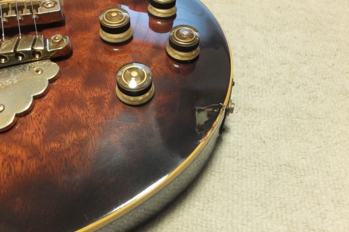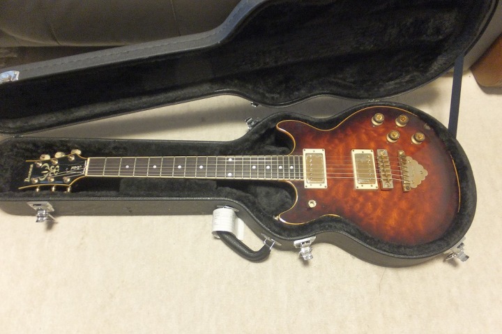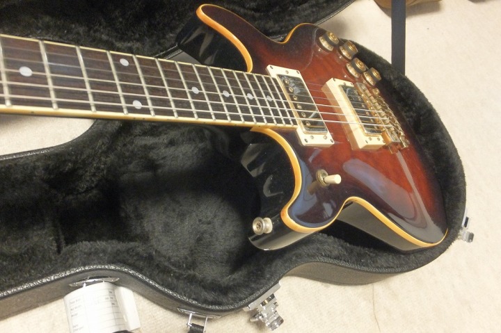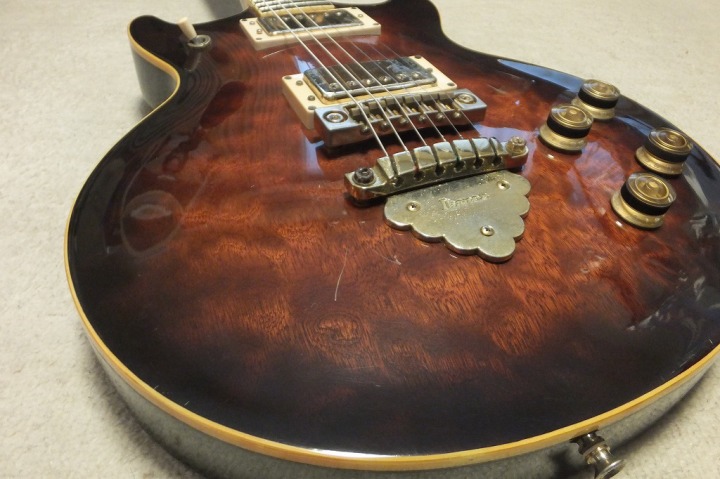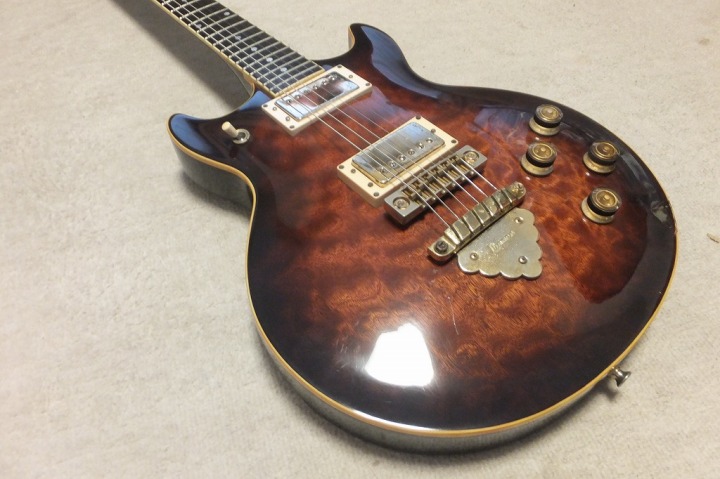| Ibanez Artist Series AR-105AV I don't know the detailed about the current Ibanez guitar. Actually, no interest for me. For me, Ibanez was the twin of Greco guitar made by Fujigen. I could remember late 70's, Ibanez was suddenly starting the domestic distribution. In my remember, Kanda shokai took their guitar with Tama Drum. A little bit later, Hoshino start the distribution directly for domestic dealers. I don't know Kanda and Hoshino had an argument for sales agreement... The first guitar, I saw it was solid body MC guitar. Looks like Greco Go series through neck construction. But Ibanez was much better body shape than Greco. It gave us sort of design impact. We knew Ibanez had a good sale in the States. Several magazine shoed their guitar such as Artist series. This is made in 1981, AR-105AV. in 81, Hoshino started the direct sales for the dealer, I think. Good designed guitar. The top material is not Maple, It should be the Burl Mahogany top. The back is Nato (the catalog said). The weight is just like Les Paul, it is heavy around 5Kg. The tone is closed to Les Paul, but more bright tone. The neck grip is feel a bit wider/thin compare with Gibson Standard. Pretty good and looks, I like. This guitar has a small paint problem at the top bottom. But it is not really bad. Try this good MIJ guitar! We will ship the guitar with used gig bag. |