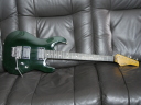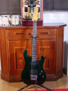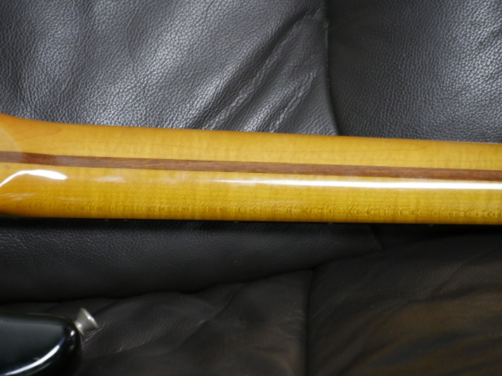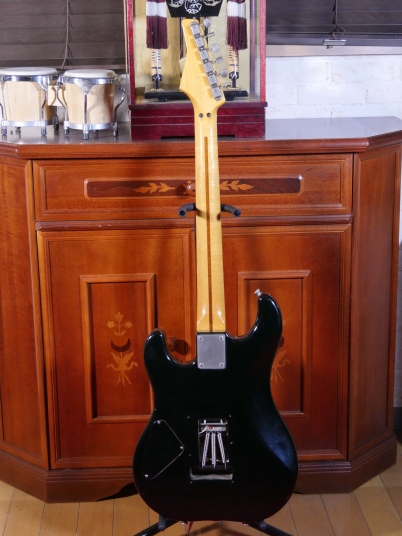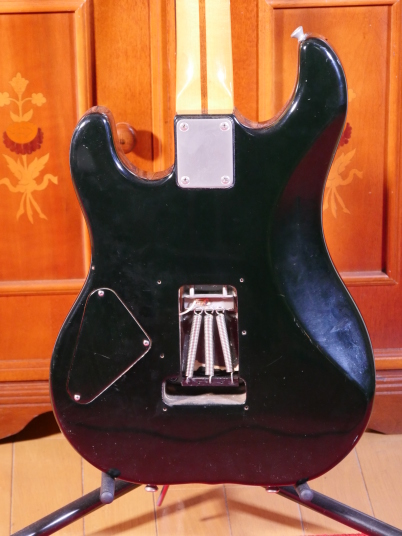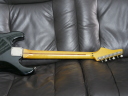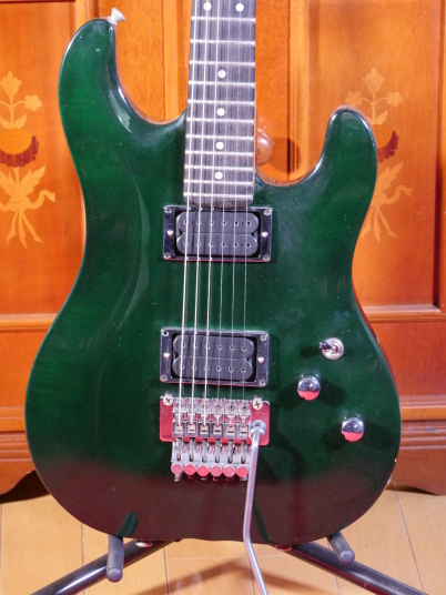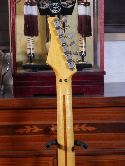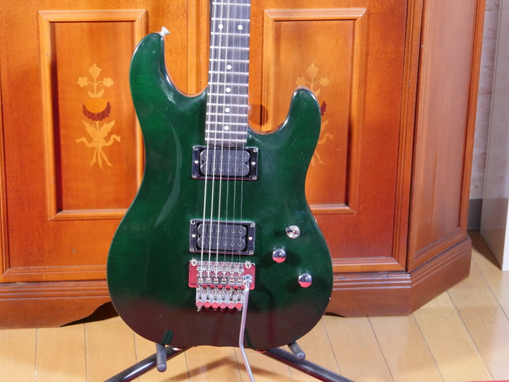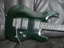 | Bossaxe Guitar Original Model Bossaxe guitar is produced by Mr. H. Shiino after H.S. Anderson. He established his own company and started the guitar shop "PACO" in Shibuya, Tokyo. Bossaxle is a brand he used before Vesta Graham or Vestax. I have 3 bossaxe strat here. One is trans. orange colored. It has much beautiful flamed wood in use. This is 4th Bossaxe guitar for me. It is original design body. I tried to check the model number, I could not read the their catalog copy I have. It is Super AXE-II ? When I got this guitar, the bridge pick up is broken (very weak signal).I tried to fix it but it is never successful. So, finally, I put 70's made Dimarzio Dual Sound PUs from my stock. These are pretty old pick up. This guitar has the special design Floyd Rose type tremolo unit. However, this unit didn't require special cavity for body front surface. It is a bit different construction. Very regretfully, the previous owner lost the original arm. This unit doesn't accept the Floyd Rose bar. I did special processed on unit to accept the Floyd Rose. Pretty good guitar! I do not know the body material. Probably Ash 2P, maple neck with ebony finger board. |