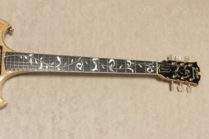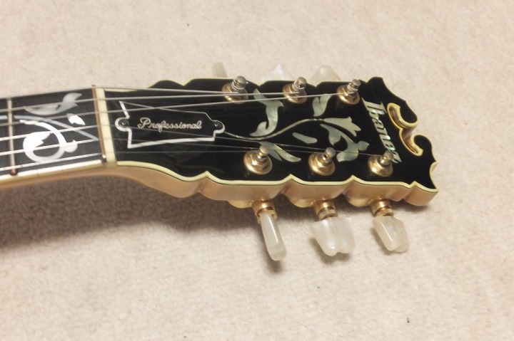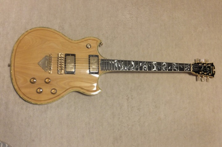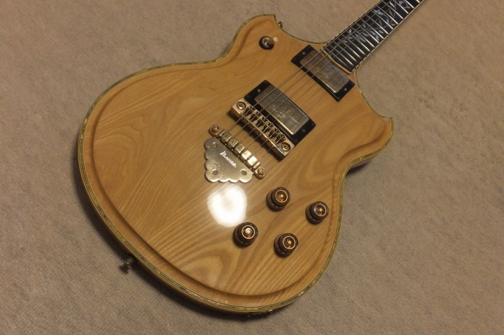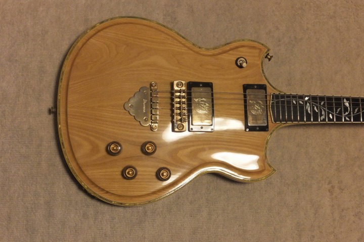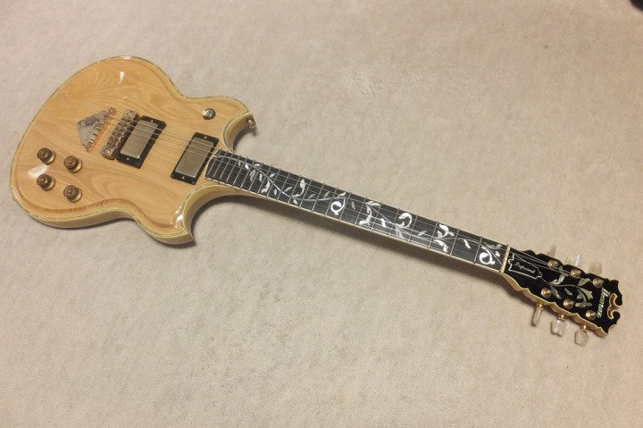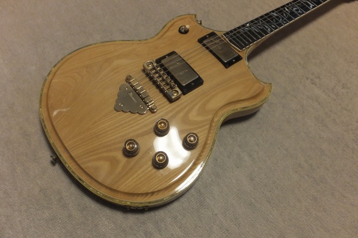 | Ibanez Professional Series Bob Weir Model # 2681 I don't know the detailed about the current Ibanez guitar. Actually, no interest for me. For me, Ibanez was the twin of Greco guitar made by Fujigen. I could remember late 70's, Ibanez was suddenly starting the domestic distribution. In my remember, Kanda shokai took their guitar with Tama Drum. A little bit later, Hoshino start the distribution directly for domestic dealers. I don't know Kanda and Hoshino had an argument for sales agreement... This is Bob Weir Model # 2681. Well, one of my dream guitar when I was uni. student. I remeber it was also so expensive guitar. The double cut way body was made by Ash Top and Back. Top is 2P and the back is 3P. Pretty heavy. The neck is Maple 3P (Moho or Rose sandwitched) neck. The nut width is 43.7mm. Iy has a beautiful ebony fingerboard with "Tree of Life" inlay. The tone is bright. The bridge PU is really bright tone. It is not Like SG tone becasue of body materials. Pretty good and looks, I like. Try this good MIJ guitar! We will ship the guitar with used gig bag. |
