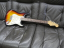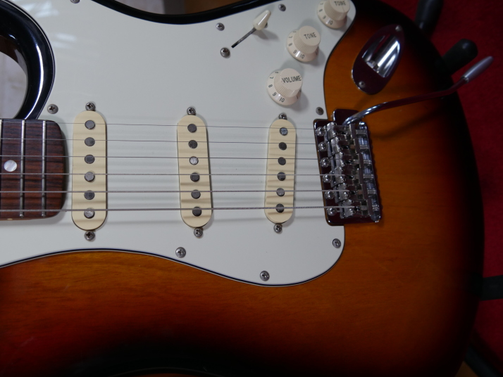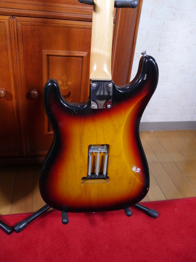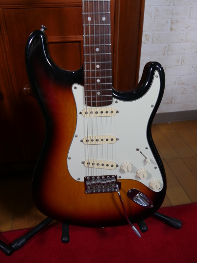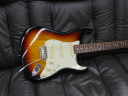 | Chandler Guitar PC-ST Chandler Guitar is originally started in CA. I think the owner (Mr. Paul Chandler) is still producing guitar there? Well, I don't know the detailed, however, Mr. Hidesato Shiino, involved this guitar producing here. His shop PACO sold this brand here both Strat and Tele body in 1989. The Ash hollow body Strat model show us a bit right tone (middle tone is pretty good) compare with 70'S ASH BODY STRAT. Yes, it has still good bottom tone. It maybe from body material, still. I never asked him which manufacture made it, maybe Morris, Terada or Kurokumo... The body is Ash hollow. It is very difficult to specify the hollow body. But its weight is only 3.2 Kg. Pretty light, isn't it? The neck is maple with 42.3 nut width. Felt a bit flat wide neck. It has the 2-carbon rod beside standard truss rod. The scale is same with Standard strat, but finger board radius is 320R. Well, pretty flat compare with standard strat. It is not really Japanese vintage guitar, but it is good history teller guitar. |