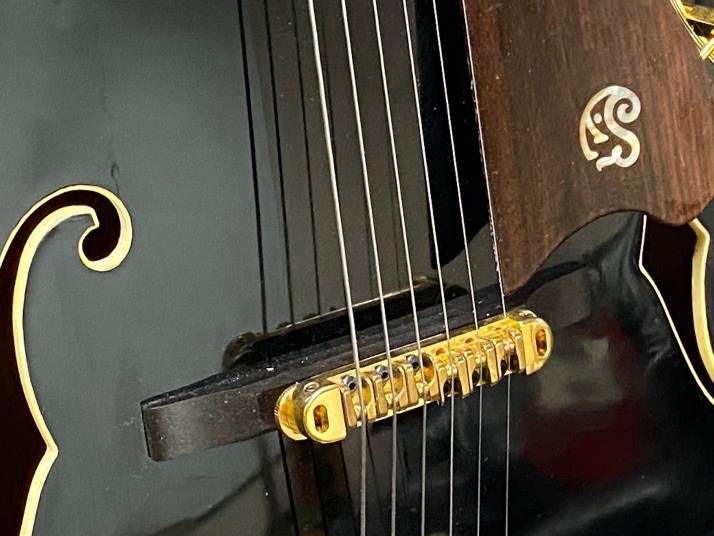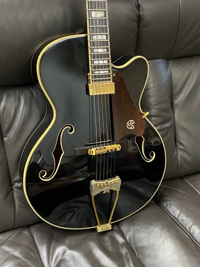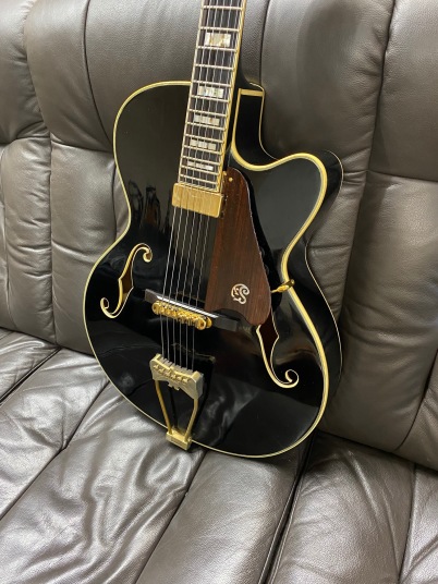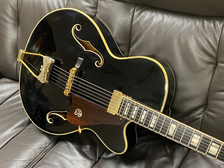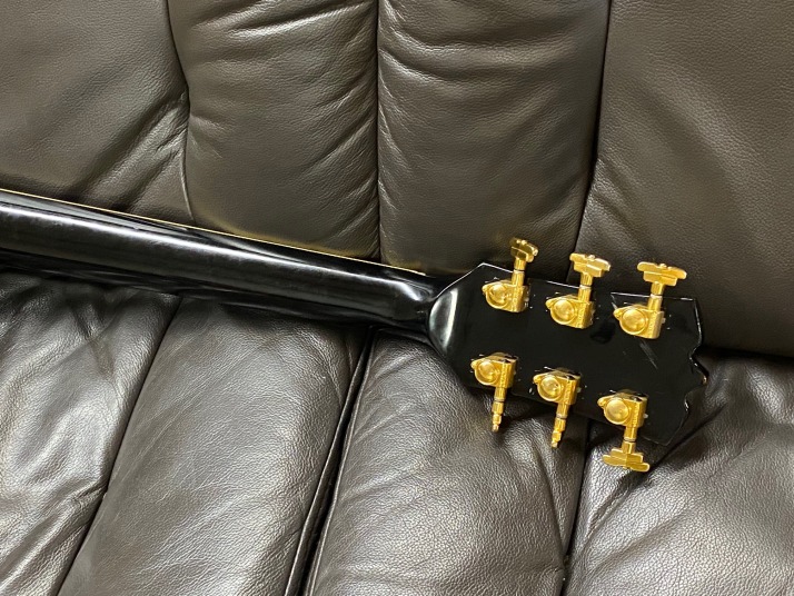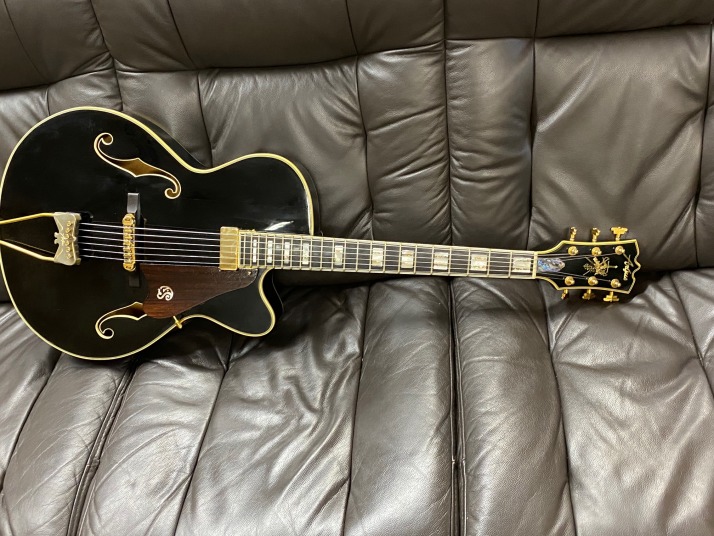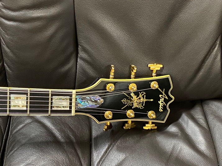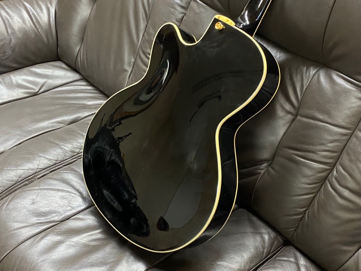 | Argus DJ-23 Excalibur Argus is a brand name of Kyowa Shokai is distributing. This brand is not available now, could see some guitar parts but long stock at shops. Kyowa shokai (it is a whole seller here) distributed many guitar brands such as Gallan, Fresher, Camel and Argus. Argus brand is top model of these brands. I have heard that this brand was produced by Mr. Shiino (who is founder of Vestax and ESP, produced H.S. Anderson ). I could imagine. Argus is very good quality and specification. They made several good full acoustic and semi-acoustic model. This guitar is one of them (I guess this guitar was build by Terada). I could not find out the detailed story of this guitar. I could not find out any catalog and flier too. I guess body material would be spruce veneer. Probably back too. No idea about the side. Neck is Moho checking from truss rod area. The black paint hide body materials. I also do not know the original specification of this guitar. When I got it, this guitar hasn't got pick guard, PU (at the end of neck, previous owner put the PU by screw), any control and plug hole. The bridge wood was bend. One of tuner was broken. And I could see a few paint cracks on body. - New Grover Imperial Tuner - New Truss Rod Cover - New Kent Armstrong PU floating type - Pick Guard (rose wood hand craft) - Pick Guard Holder - wheel type VT pot - Roller Type Metal Bridge (Stewart Mac) - Body end strap button type Plug (Switch Craft) - Cracks repairs Now, I put the flat wound strings on this guitar. 16 inch bodyGibson scale guitar give us pretty good tone! I . |