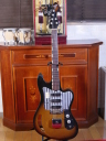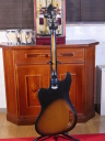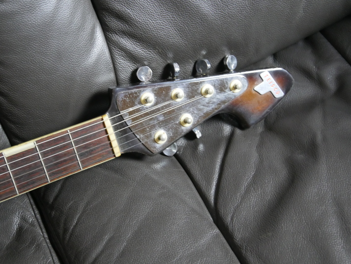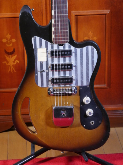 | TEISCO TG The 1960s were a childhood for me, my family added TVs, washing machines, telephones, record players, microwave ovens, etc. one by one that time. I remember watching the Olympics on TV. There was a student movement, but it was an era of high economic growth. The export value, which was 4,055 Million US $ in 1960, became 20,000 Million US $ in 1970. Economic margins make many cultures bloom. Outside of Japan, it was the time of the Vietnam War, but the momentum of the war was increasing in the United States. It made Hippies, psychedelic rock is born in music. The Japanese musical instrument industry sales were increased by Hawaiian music booming and later Ventures music. The economy development made many young people could easily pick up the guitars at home. The Japanese musical instrument industry such as TEISCO, GUYATONE and other were growing significantly during this period. Tesco was actually founded in 1946 and initially manufactured steel guitars and amplifiers for Hawaiian music. The production of electric guitars also started in 1952, and will lead the electric boom in the 1960s. Since the distribution of musical instruments was almost the same as record sales, record companies and audio companies also Started selling guitars. Musical instrument makers have also started exporting, helped by the booming overseas economy. I have heard many young American soldiers who stayed in Japan bought the guitars during the Vietnam War. Probably it was proper price toys for them. The guitar born in the year of the Tokyo Olympics is this TG series. Perhaps it was influenced by FENDER JAGUAR released in 1962, I felt. There is a hole called Monkey Grip. Is it for balance or is it easier to hold by hand? It's unclear if it's just a design, but it's a unique design. The neck is FAT and looks like GIBSON. Generally, the neck of Japanese electric guitars around this time is thick. It's too thick for me with small hands. It is not really a good guitar, compare with the current technical standards. However, such a point makes me feel nostalgic. PICK UP is also a single type and very clean tone. Is the metal pick-guard made for Noise protection? Or just cost effectiveness? Anyway, it works as noise countermeasure. Interesting is the tremolo knit, which is well thought out as a cavity-less, mounting-only method. Probably, these constructions were influenced by Bigsby unit. Obviously, simple construction and mounting method are mass production essential. Well, Teisco TG is a historical model of the Japanese guitar industry. |