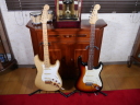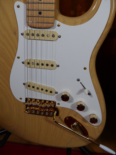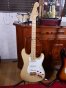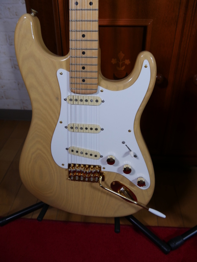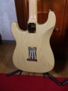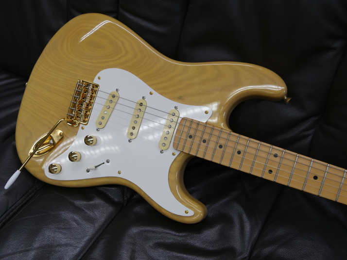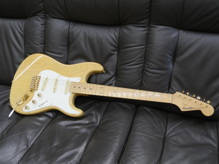 | Chandler Guitar PC-ST Chandler Guitar is originally started in CA. I think the owner (Mr. Paul Chandler) is still producing guitar there? Well, I don't know the detailed, however, Mr. Hidesato Shiino, involved this guitar producing here. His shop PACO sold this brand here both Strat and Tele body in 1989. The Ash hollow body Strat model show us a bit right tone (middle tone is pretty good) compare with 70'S ASH BODY STRAT. Yes, it has still good bottom tone. It maybe from body material, still. I never asked him which manufacture made it, maybe Morris, Terada or Kurokumo... The body is Ash hollow. It is very difficult to specify the hollow body. But its weight is only 3.7 Kg. I suspect this is not hollow body. I should use the inflared sensor to check it. The neck is maple with 42.3 nut width. Felt a bit flat wide neck. It has the 2-carbon rod beside standard truss rod. The scale is same with Standard strat, but finger board radius is 320R. Well, pretty flat compare with standard strat. It is not really Japanese vintage guitar, but it is good history teller guitar. |