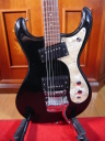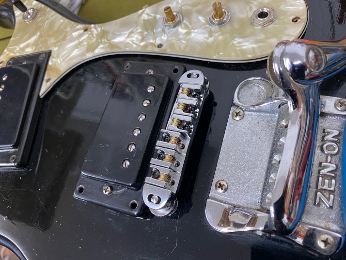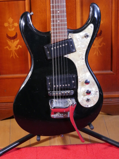 | Moraless Zenon ZES-300 Moslite Model I'm not a generation who played Ventures so much. But they are my favorite sound. However, I didn't pay attention so much about the Moslite guitar and its replica. This morales guitar is 2nd for me. Very regretfully, once I got it, there are many problems. 1) 2 pick ups were broken 2) No bridge (The previous owner lost it) 3) Tremolo Spring was missing 4) The tuner (beg) were rusted 5) Most of screws were rusted 6) Pickgurad and mount rings were damaged by aging Took a long time to change all parts and repairing. Now, this guitar looks old, but its inside are many brand new parts 1) Gotoh Rotomatic tuner 2) 70's humbuckers (no idea but from my stock) 3) Bridge Brand new roller type 4) CTS volume and tone pod, switch craft selector and jack 5) Wires are belden 6) cracked platic parts were fixed The neck is straight. Truss rod is working. Frets are proper condition. I don't know the wood materials. The body is solid wood. But I could not specify what it is. Became good looks old days guitar now. |