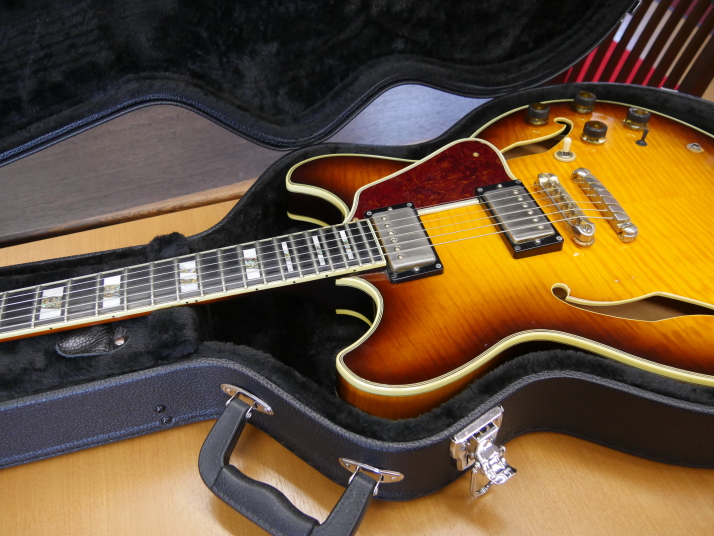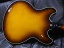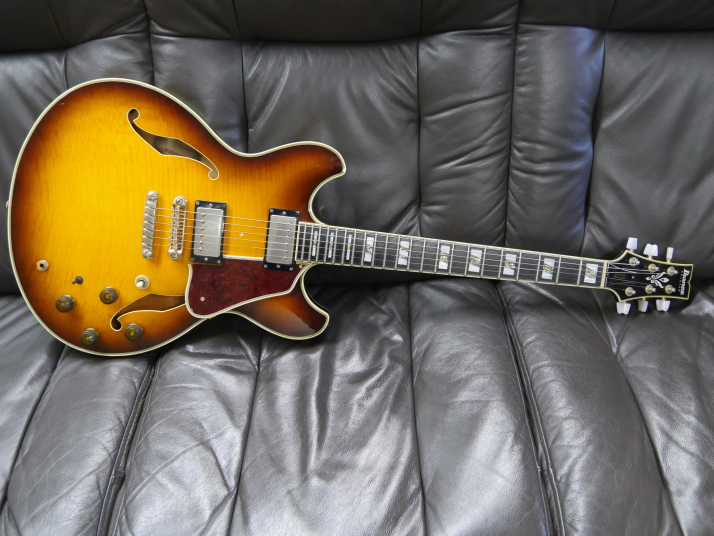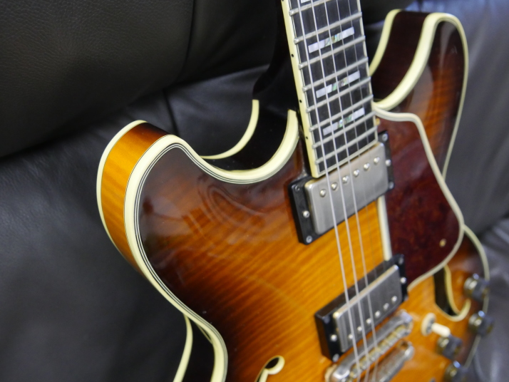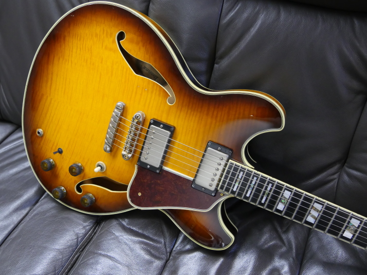 | Ibanez AS200 We could see many Japanese made guitar. Except hand crafted guitar, there are sevral famous Semi-Acoustic guitars. Yamaha SA-2000/2200 and Ibenze AS-200 are probably famous mass production model. Yamaha is still producing SA series. Ibanez has been transferred many guitars production in China. They have several guitars which have been produced in Fujigen, Japan. I think they made only high pricing model now. I have both Yamaha SA and Ibanez AS here. I felt the Ibanez has more sharp (Clear) tone compare with Yamaha. Yamaha is more sweet tone. It depends on what kinds of music you are playing. I love both of them, anyway. AS has 3 ply (Maho+Maple+Maho) neck. Maybe this neck construction made a bit sharo tone. I do not have Gibson ES-335 here, so I could not compare, but Gibson ES-335 is Maho neck. Maybe it is warm tone. This guitar is pretty good condition. Maybe early 90's made from serial. Only pickup mount rings were changed (I have the original cream color one). All functions are fine including, electronis, neck, frets and etc... We are going to ship this guitar with hard case (not Ibanez original) to protect the body. |
