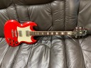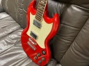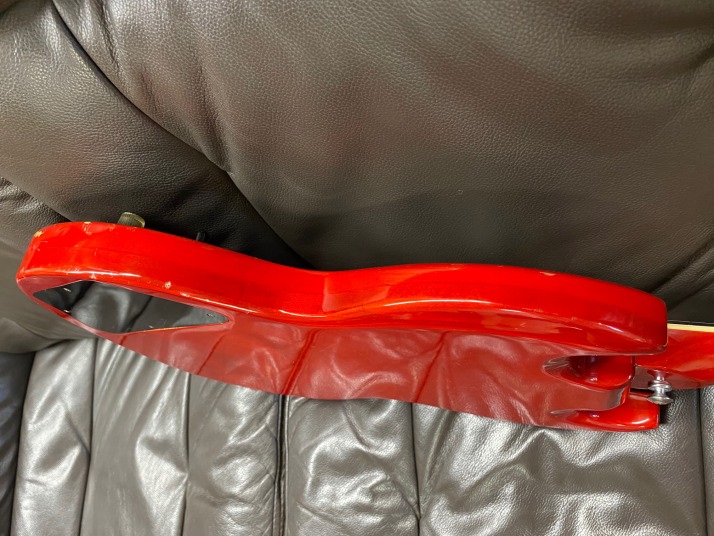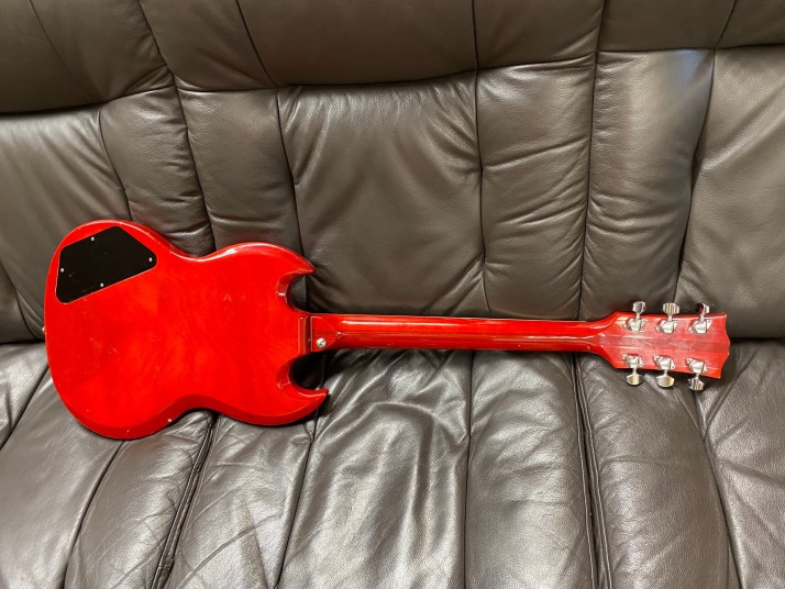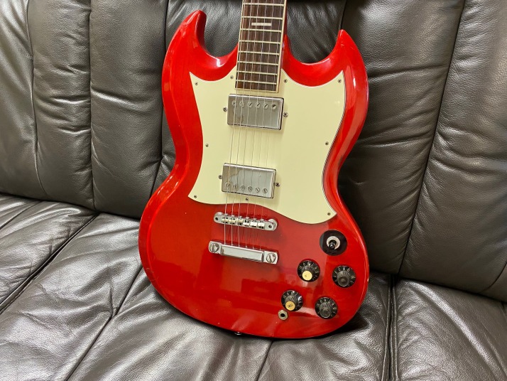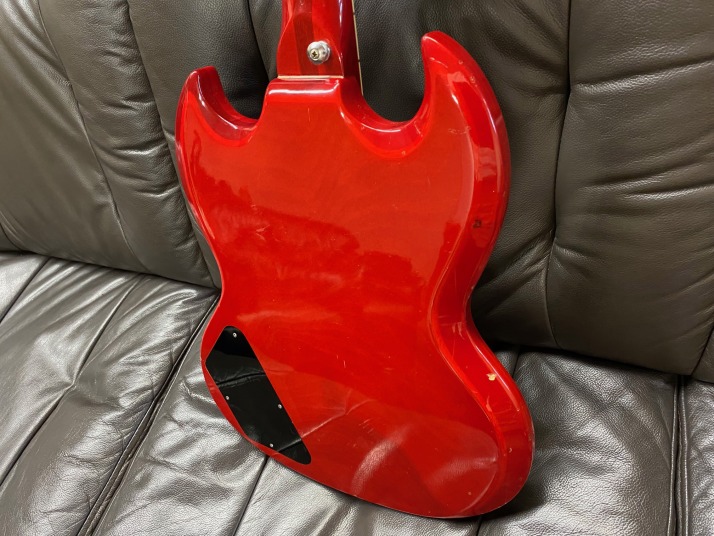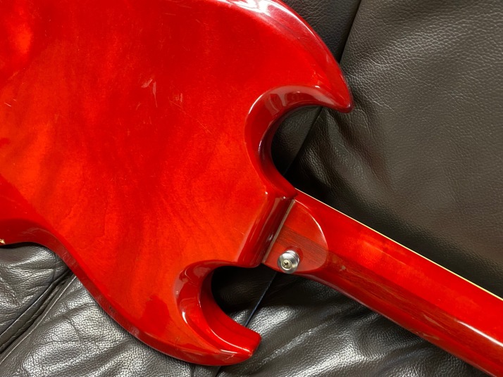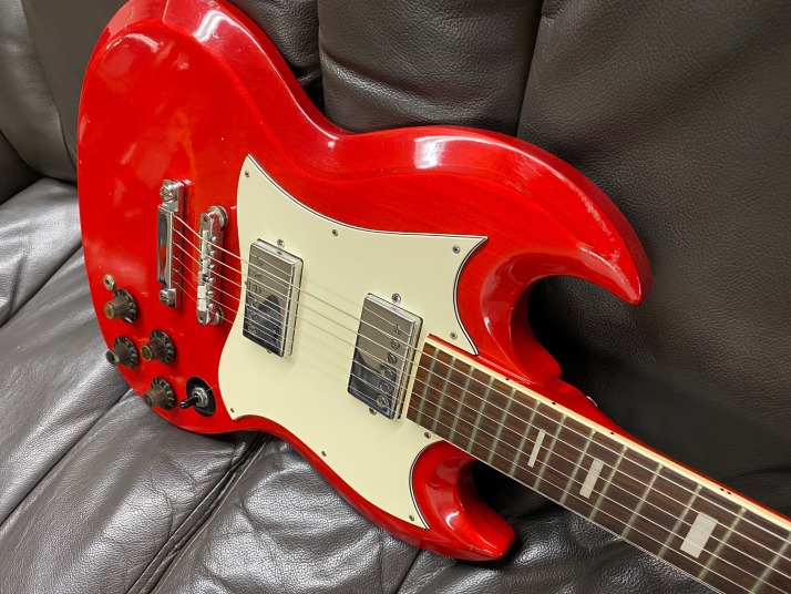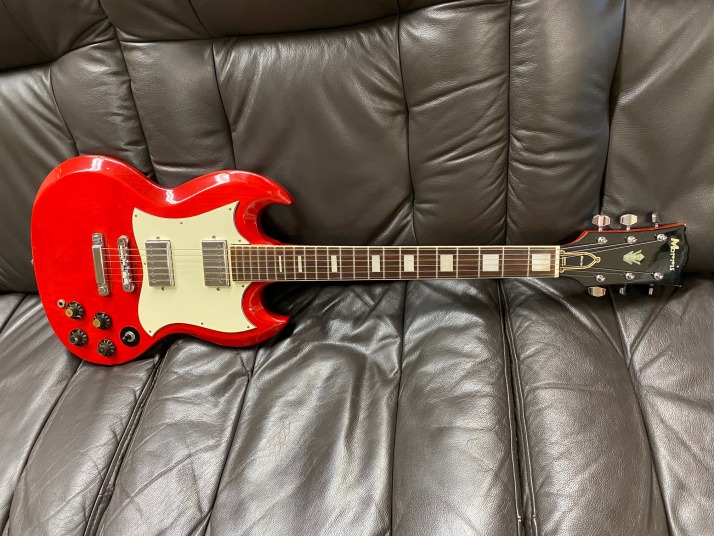 | Morris 70's made SG model As you may know, Morris is a leading acoustic guitar manufacturer and distributor in Japan. They currently concentrate the acoustic guitar. Well, they are still offering the electric model such as H.S. Anderson, Bill Lawrence and overseas made base... In 70's Morris offered Morris Brand electric guitars as other guitar manufacturer here. At the begging, they offered only bolt on type electric even Gibson replica. We could see those Morris guitars on WEB site. However, it is very rare to see the set neck type. This is second Morris Set neck SG for me. Pretty good condition too. The neck, frets and electric circuits, all perfect. Somebody just keep the guitar. I think no modifications. When I get this guitar, the knobs indicator plates are gone. Also the selector switch is broken. I fixed both of them. I have another Morris SG. This guitar is slightly different. This one has the big pickguard. Probably, they made both models at a time. Nobody is interested in Morris Electric guitars. But for me, I love those guitars which many people didn't pay attention, but super rare. The set-neck type SG and Les Paul model are very limited to produce. So I do not have an intention to sell this guitar. As Gibson replica, this is not good one. But considering the Japanese guitar history, this guitar is pretty important. Please just enjoy to have a look ! P.S. After checking, I have changed the selector switch to switchcraft made. Also, I put a plastic made saddle of bridge instead of metal one. The picture shows metal saddle on 3rd string. Now it is plasitc with others. The 70's vintage knobs are installed too. |