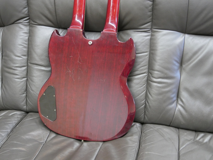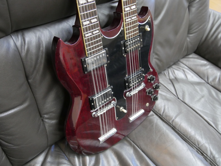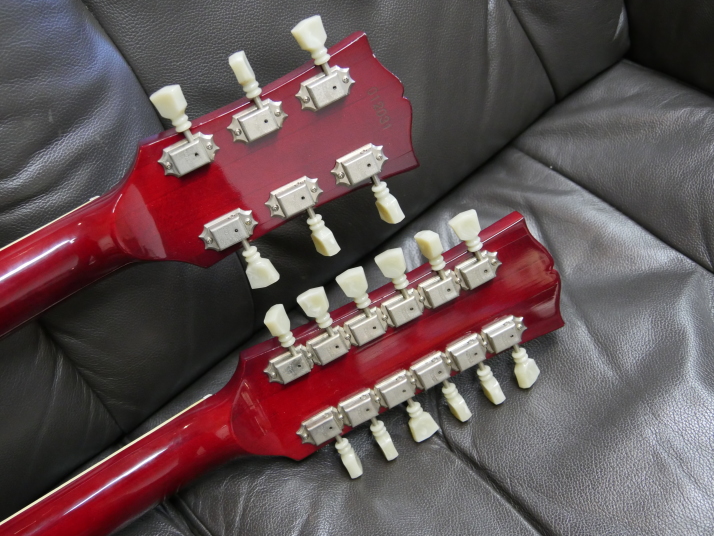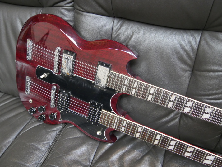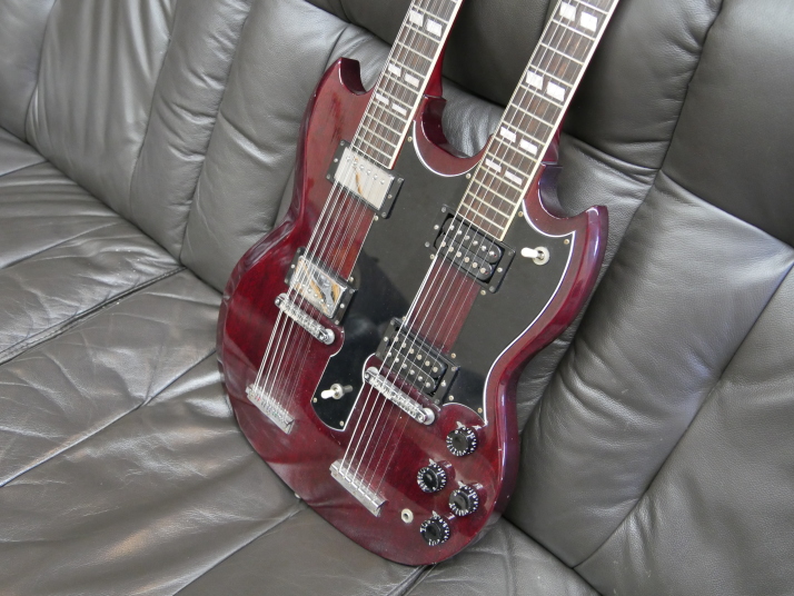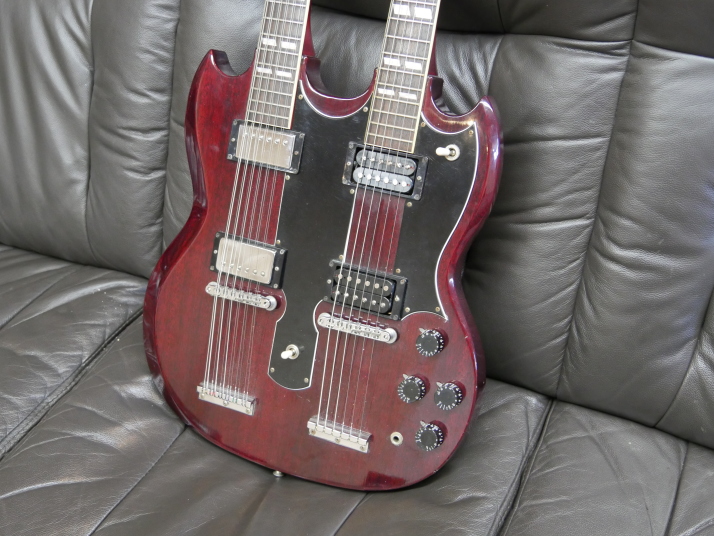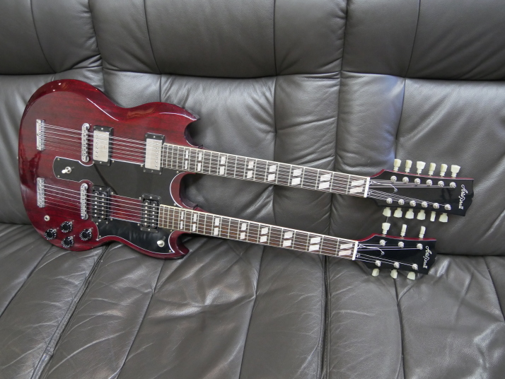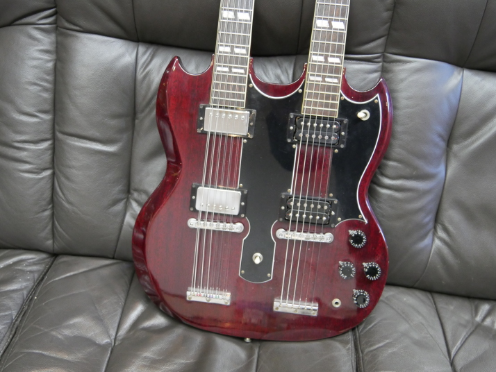 | ARIA PRO-II SG Double Neck Well, the guitar Hero, Jimmy Page Model SG Double Neck. Not Gibson made guitar. This is absolutely JV guitar, Aria Pro II brand, probably Matsumoku made guitar. I do not know Gibson original EDS. So, it is difficult to evaluate this Aria is good or not as replica. The reason I got this guitar is I want to get 12 strings electric guitar. I have been looking for Rick 12 strings type. Unfortunately, it is getting tough to get the good condition JV 12 strings. Price of those JV is higher and higher after COVID pandemic. Anyhow, I got this guitar. This guitar is giving me a good impression. The 12 strings sound is pretty good, I satisfied. The looks good too. It is Jimmy page looks guitar. Again, I don't know Gibson original, therefore no idea, how this guitar's construction is closed to Gibson. Like body wood, neck wood...no idea. But for me, it is enough quality. I have changed the pickup to Gotoh Classic Alpha type Humbucker. The original PU have the cream bobbins. It can not be look like Jimmy's. So, I changed it and switch knobs. So far, that's all, I did. I do not intend to sell this guitar now. Love it pretty much. Just see the pictures for your reference. |