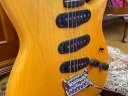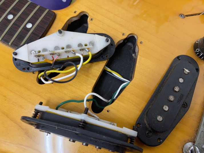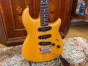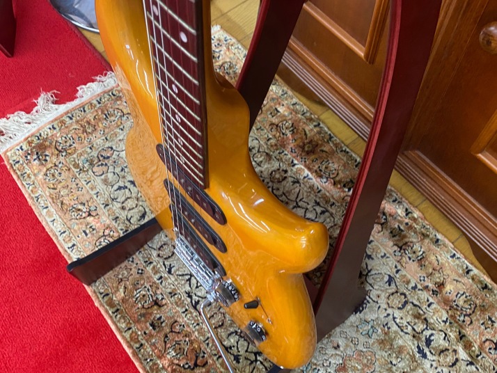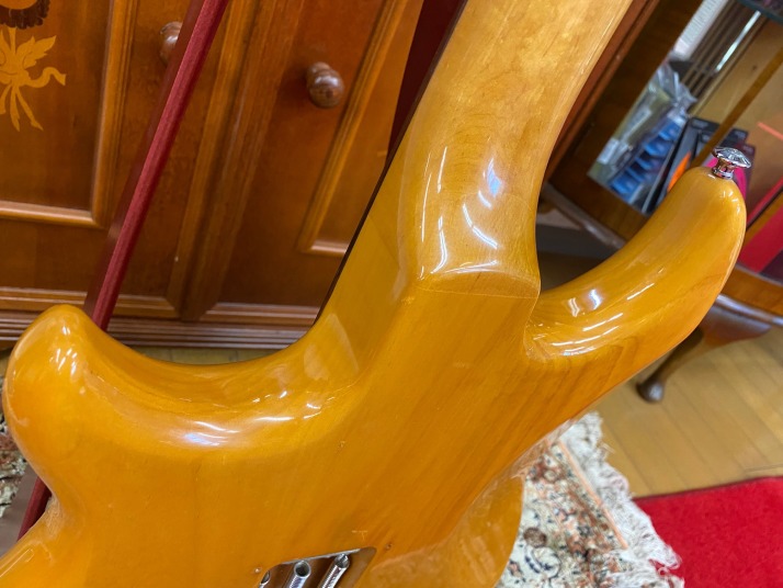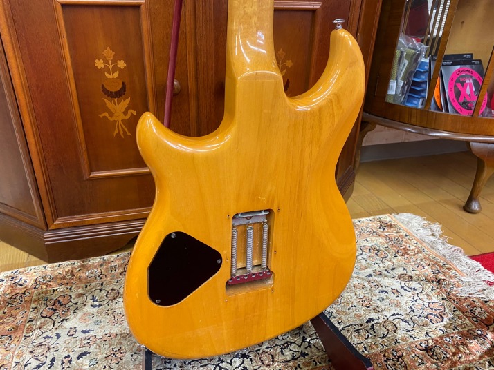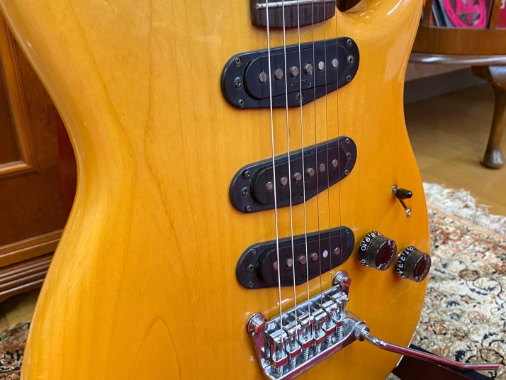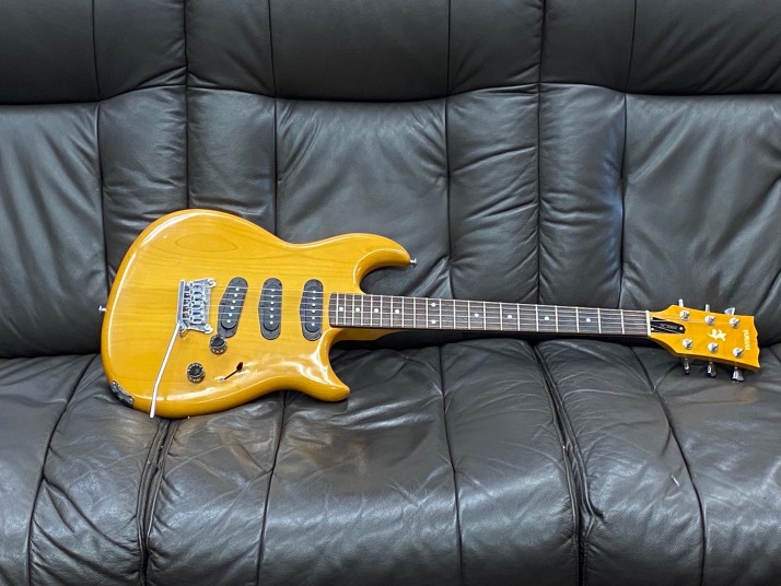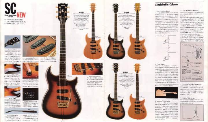 | I love Yamaha Guitars. Specially, their original design model are pretty good. Yes, some of them not really good design guitar, but as musical instruments, Yamaha is always great. However, only problem. Yamaha guitar parts are mostly not interchangeable with Gibson, Fender and other major guitar parts size.Therefore, once some parts were broken or missing, the end-user have a headache. Like Yamaha SG ! PU size, PU mount rings, screws, Bridge size, Tailpiece size... Really headache. The, Yamaha stopped the service parts distribution already. This guitar is same. This one is SC series in 1981. The 6 in-line head was changed to Gibson 3+3 type. I do not know why they changed. They took off 3 mini switches and put the 5way switches instead, just like Strat mode. Knobs are volume and tone. Tone knob is push-push type, it can change the number of coil turns. They said by-sound system (you could see the hot wires). They tone is getting more fat when it is ON, bid like humbucker feel. Tremolo unit is Yamaha original design. 2 points stud type with thick bar. It may work for the tuning stability. After I got this guitar, I re-assembled and cleared up. The push-push switch was damaged so, replaced with ESP push-push pod. Now this guitar is becoming just like brand new. Well, pretty good JV guitar! |