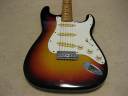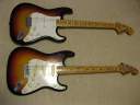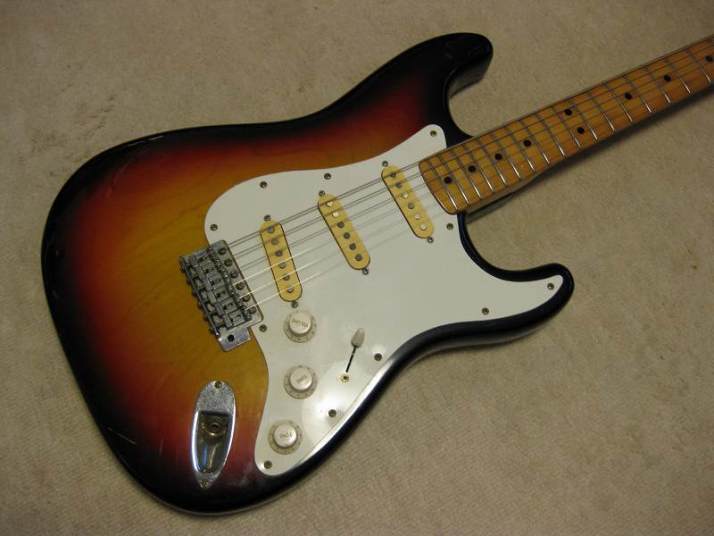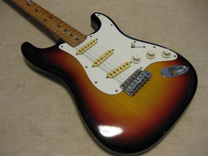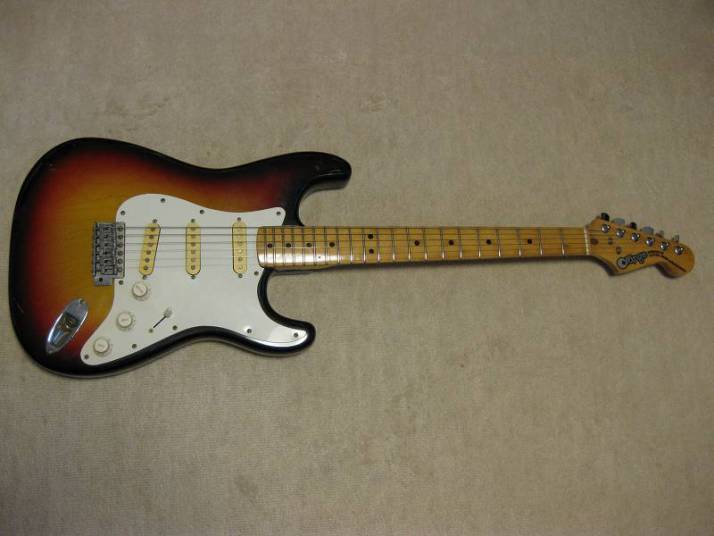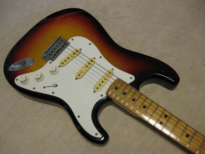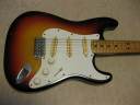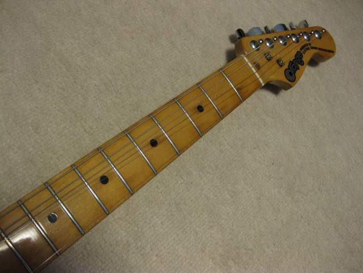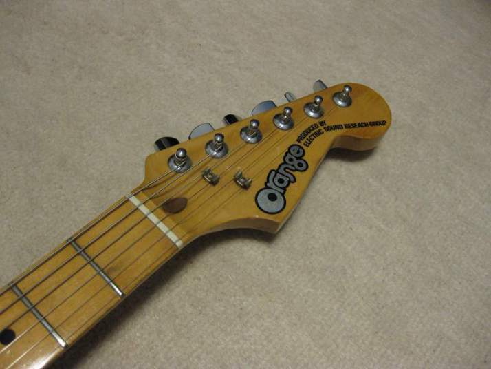 | Orange Stratocaster 62 model This is very rare brand. I have heard that one of Osaka music store made a marketing plan to sell This OEM guitar with Fernandes or Kawai. Probably, they didn't satisfy the replica of Fernandes. Probably this is before Stone Logo FST (tokai made) era. I have check the body construction. It is very similar with Fernandes FTS-70 series. The difference from old Fernandes is the neck finger board. Orange is 1P maple neck. Well, Fernandes 76/77 made FST series have the 1P neck for short period. I had a few, but the specifications are much closed to Tokai made stone logo type. From the catalog information, there were small head (62 model) and large head (68 model), This is small head type like 62 model. As replica, this guitar is not really fine. You could see 2 strings guide on the head. The body is probably Sen with 4.25Kg. The neck is Maple 1P, C shaped grip, with 41.3 mm Nut width. I have put the only strap pins. It is very good tone guitar! Really good looking over 30years old guitar. The last picture is showing both small and large head Orange Stratocaster! |
