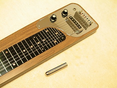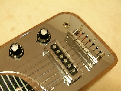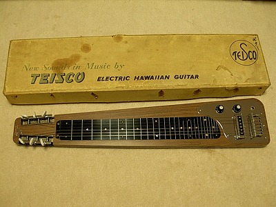 | Teisco Steel Guitar 60's made Well, this is first time for me to get the steel guitar. Of course, I knew it but I don't listen the country & Hawaian music. I could only remember Pink Floyd used the Lap Steel guitar. So, I didn't pay attention, I don't know even how to tune. Now, I have played a bit, but not well. This steel guitar is very good condition. Metal parts are still fine. Of course, electric circuit are fine. Please see the below photo. This guitar has even original box and bar. If you would like to try to use the steel guitar on your band or recording, Please try this vintage Steel Guitar ! |