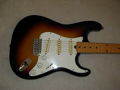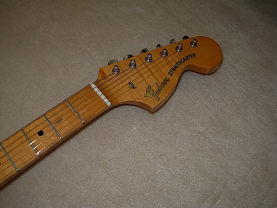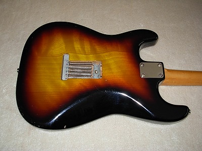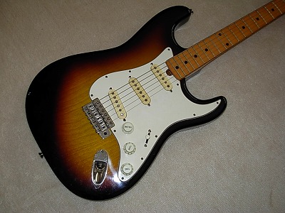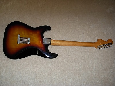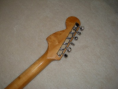 | Gaban ST Type This should be late production of Gaban. The logo is slightly different from early Gaban series. As you may know, Gaban was distributed by Fukuhara Gakki, produced by Kasuga Gakki. Therefore, this is the brother of Ganson, Heerby and Yamaha Start. It is very early time guitar, probably, 1974-77 But I never seen this type of logo mark. Gaban will be changed the Kasuga and Heerby. The condition of this guitar is good. Of course, it is over 30 years old guitar. There are many dent sand scratches. But these are not really visible (refer the pictures). The neck is 3P + Maple finger board. It has a bit flamed. The neck, frets and electric circuits are fine. The middel pick up is not original. The nut is not like Fender style. It is almost like Gibson style nut. Well, it is not really good Strat Replica, but pretty good deep tone. This is very rare guitar even not really good replica. If you are looking for the good, rare JV guitar, this is one of them. |