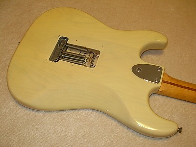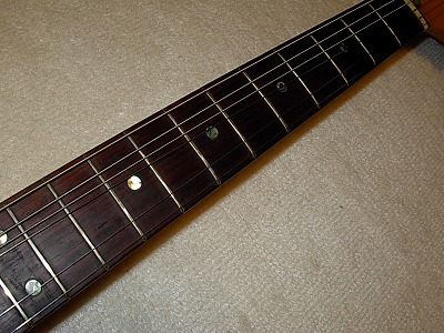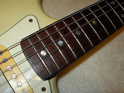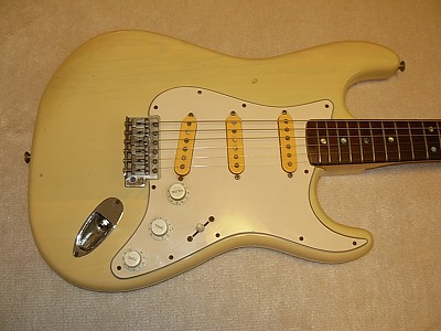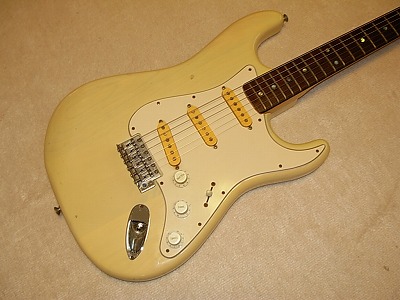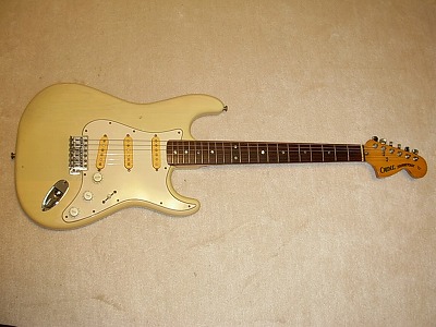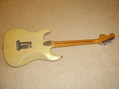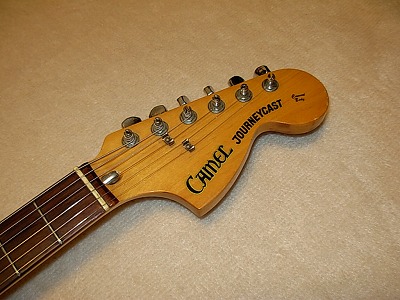 | Camel Chushin Gakki Stratcaster 72 Model Camel Brand is top model of Kyowa Shokai distributed in 70's. Gallan and Fresher were their main brand. They added this brand late 70's. Camel brand guitars were better replica than others. I have several Camel stratcaster. Camel is one of good Strat Replica even compare with other brands. This guitar, when I got, hasn't got a position mark off (maybe 14F, it was) Therefore, I re-inlay the mother of pearls there. I put all of them. It looks very good. I have checked all, the neck, frets and electric component s are all checked and fine. It is good condition. The body has several small dents and scratches, but these are not really serious. As you can see, generally, it is good looking as over 30 years old guitar. Just try Japanese Vintage guitar! |