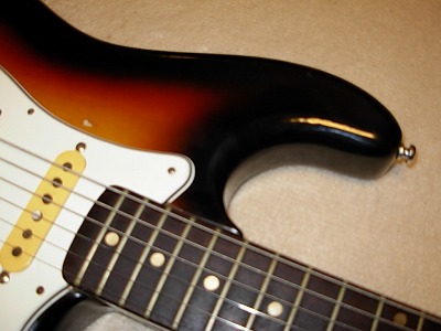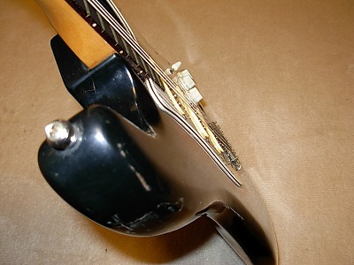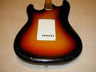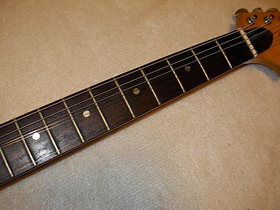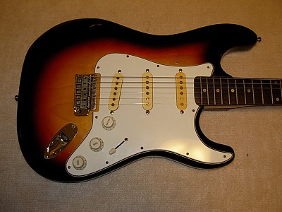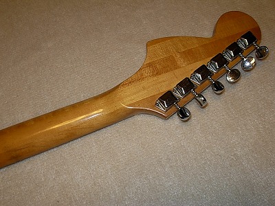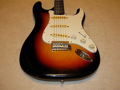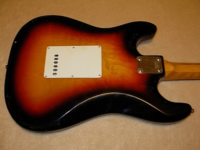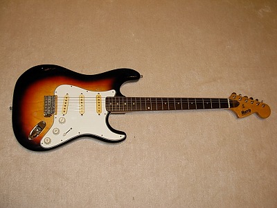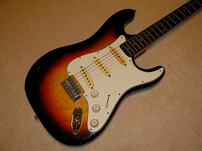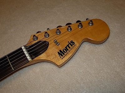 | Morris Stratcaster This should be very old Morris Stratcaster. As you know, Morris guitar is one of leading guitar manufacturer here. Specially, they are well-know as acoustic guitar manufacturer. Of course, they made the electric guitar. I found out the Morris electric guitar when I was Jr, High school student (well it is over 35 years ago). I saw the Les Paul and Strat model at music shop. This guitar is exactly I saw that time. It is not really good replica. Morris just made similar looks guitar with Fender. The neck is 4P with metal made truss-rod cover. Several Manufacturers made this style Fender replica at the begging. The nut is Gibson style. I don't know why. They maybe made these guitars from the pictures. The body is laminated body. These earlier replica guitars made by laminated wood in many case. Well, so, it is not really good replica guitar. However, it is a good history teller for JV guitar's history, that's why I keep. In early 70's here, Greco, Fernandes, Yamaha and Morris are major guitar brand. If you are collecting the JV guitars, this is one you should collect. Morris is changing the brand name after these earlier made guitars. They use the H.S. Anderson, Bill Lawrence, Bill's brothers and others after Morris brand. Just try Japanese Vintage guitar! Note : The Neck PU output is slightly lower than others. |