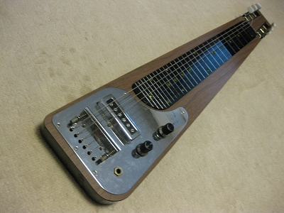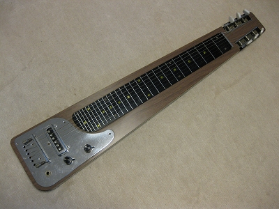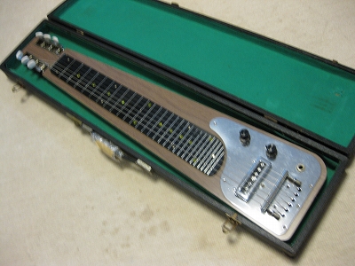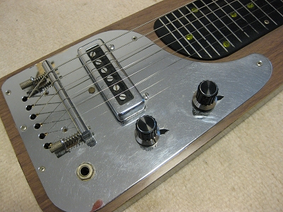 | Teisco Steel Guitar 60's made I'm now collecting only 6 string old steel guitar. It is very interesting. Actually, I have a plan to build the steel guitar by myself. I've been writing many drawings and thinking to use the rare wood. So far, I'm only interested 6 string. Because, I don't know how to play. So I tuned like guitar use open tuning. This steel guitar is very good condition. But the brand name Logo is missing. But this is absolutely Teisco, I sold same model several months ago. Metal parts are little bit rusted but not seriously. Please see the below photo. This guitar has even original hard case. If you would like to try to use the steel guitar on your band or recording, Please try this vintage Steel Guitar ! The new Fender strings will be delivered. The center hinge of hard case is not working well. |