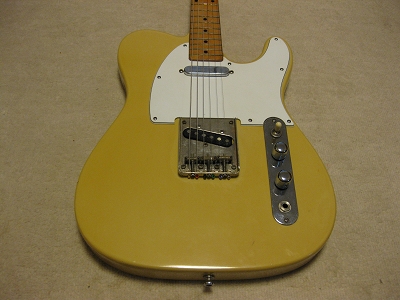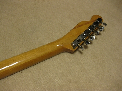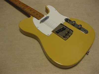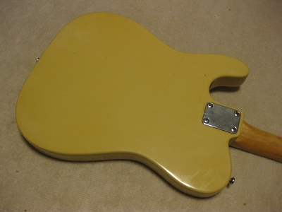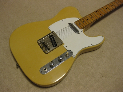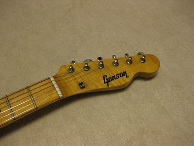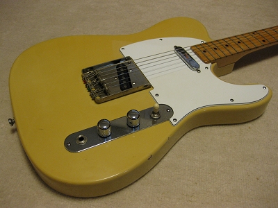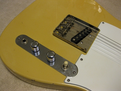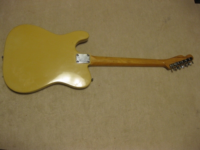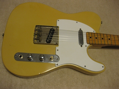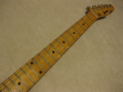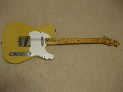 | Ganson (Kasuga) early 70's Telecaster model This is very funny Telecaster Replica. Well, it is not really good replica. But we could feel it is very pretty. When, I get this guitar, all electric circuits are gone include the PUs. So, I re-assemble all. Just keep the control plate and bridge. Both PUs are 70's made Strat PU (Maybe Greco or Heerby, I could not remember). I processed to attach these for this guitar cavity. The electric circuits are all new. Japanese made potentiometers (250K), Switchcraft selector, Switchcraft output Jack and orange drop capacitor are wired. NO wood processing. I have also changed the rusted screws to the new one. The bridge parts are just cleaned up. The neck is straight. The truss rod is still O.K. The frets are worn, but still we could play (If you feel you don't lie, please do it by yourself). The neck is 3P with Maple finger board. The head is laminated with flame maple! I'm not sure about the body. It seems to be Agatis wood? 2PLY and don't know how many piece. I'm playing this guitar very often now. This is pretty cute guitar. The sound is fine for me. I don't know how you will feel. The neck PU cover is pretty big. So, it covered the sound worm just like Jazz Guitar tone. I would say this is real JV guitar !!! |