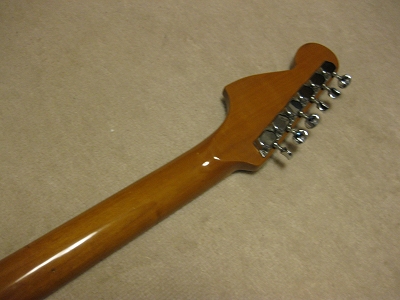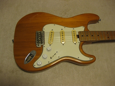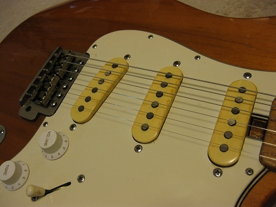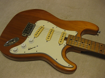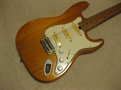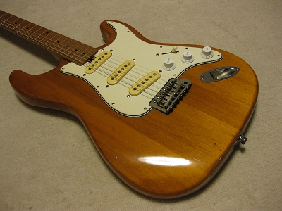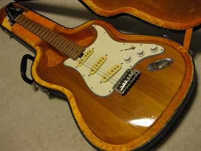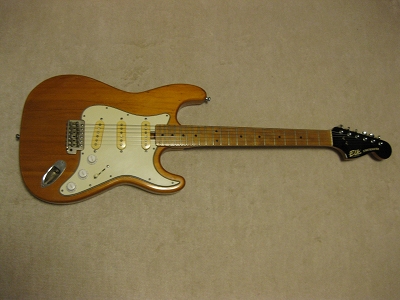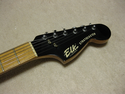 | ELK Stratocaster I got this guitar after looking for a long time. Many people are collecting the ELK guitar. As I said before, ELK is one of Bizarre ELK is one of leading brand name in 60-70's. They made many AMP like Fender model. When I was a boy, ELK is one of good AMP, but very expensive tube AMP. Of course, Fender is most expensive and almost impossible to get for the teenage boys. So, many boys are collecting the catalog at shops. I was collecting many and felt ELK guitar is one of favorite in early 70's. After that, the market was occurred by Greco, Fernandes, Tokai and etc... ELK was getting only brand name for AMP. I've heard the factory (Miyuki) is now providing it for Fender Japan AMP. The ELK guitar was very expensive that time. This model is JYE 49,000 over 35 years. I have several ELK guitars (Les Paul and SG). These were special model for professional players. Anyway, this guitar is not really great replica. The Pick up size is not same with Fender original even with Japanese metric size PUs. It is slightly bigger. The sound is much fat than normal single coil PUs. I have changed the out put jack only. The neck(1P + MFB)is straight. Truss rod is still adjustable. Frets are fine too. The body is 2PLY solid body. It is 3-4P. It is not like Strat sound, but I like this old fashion guitar very much. This is absolutely historical guitar. I would say this is real JV guitar !!! |