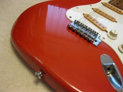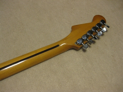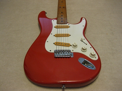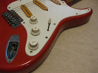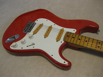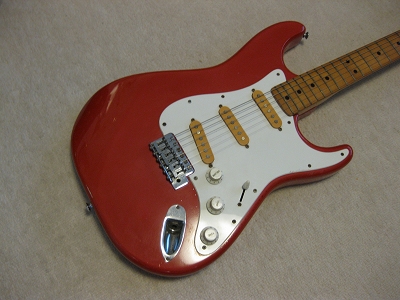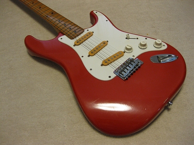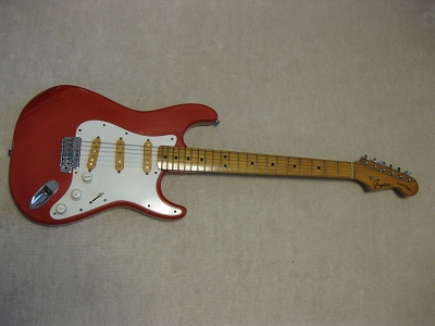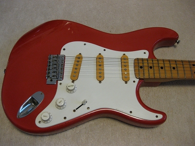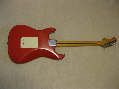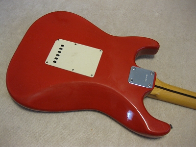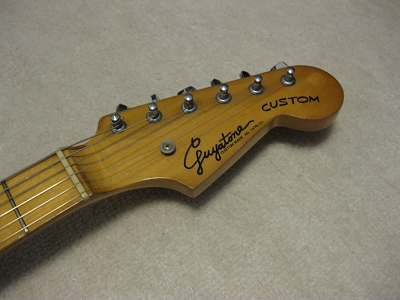 | Guyatone Stratocaster Model Small Head 54 type Guyatone is a leading manufacturer of Guitar Tube Amplifier in 1970-80's. They offered many good tube AMP, I remember. Guyatone has a long history as guitar manufacturer too. The company was established in 1956 as Tokyo Sound Co., Ltd. Guyatone is just trade name. They offered both guitars and AMP. Probably, in 1960's, it was a first golden time of electric guitar here. They offered the guitars like Moslite, EKO, Vox, Rickenbucker style & etc.. So, many collectors here are looking for these guitars. (I'm not interested). Getting into 70's, Guyatone started to make the replica guitars. They made many replicas. This is one of their good replica. I think they made Les Paul, Tele, SG and etc... And also, they made several original design such as Glory, Malory and others. I'm not sure which manufacturer made Guyatone guitar. But after checking the body inside, I felt this one made by Kasuga (Heerby) or Chushin (Later Fresher). This guitar is generally good condition and very rare original Fiesta Red colored. Probably, all original condition. The neck is straight and frets are proper condition with standard C shape. The body is Ply wood with 3.6 Kg. The volume pot was changed to CTS by previous user. It isnot really great replica. HOwever, the sound is good. You could enjoy this guitar well. |