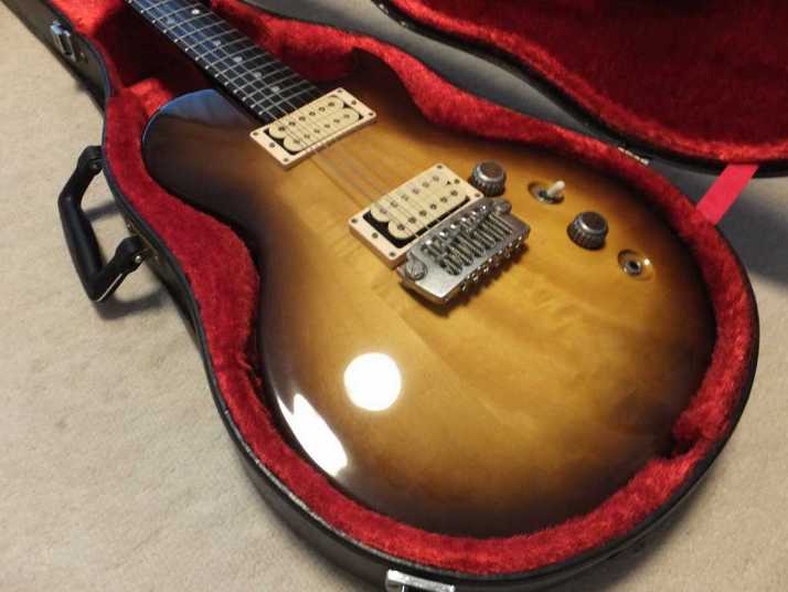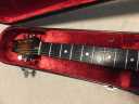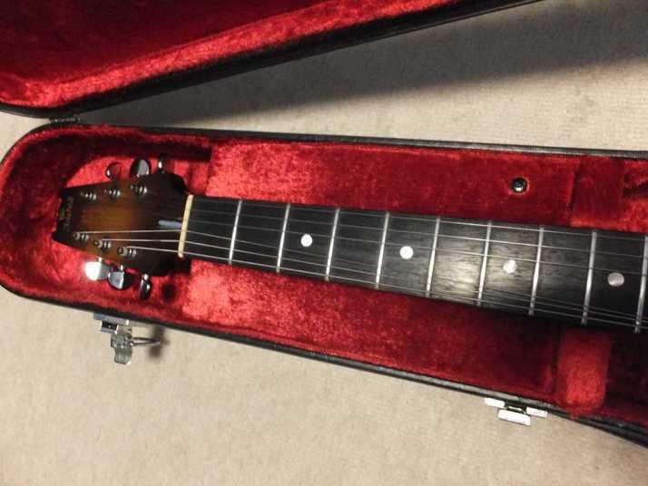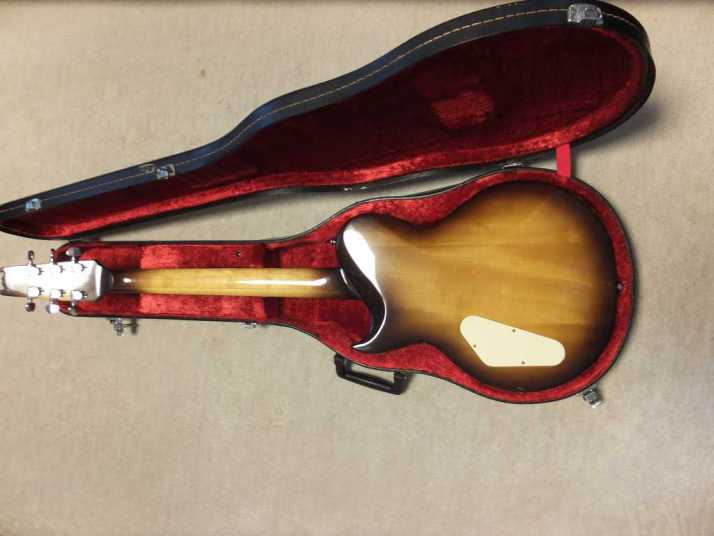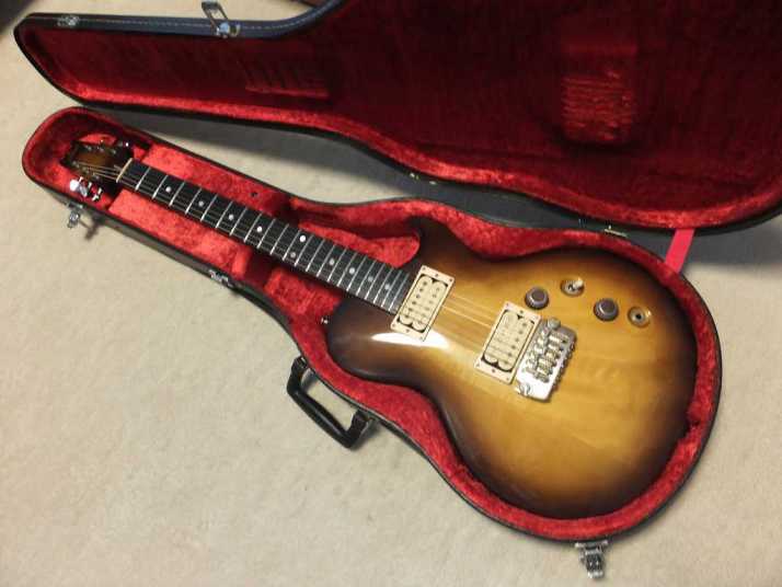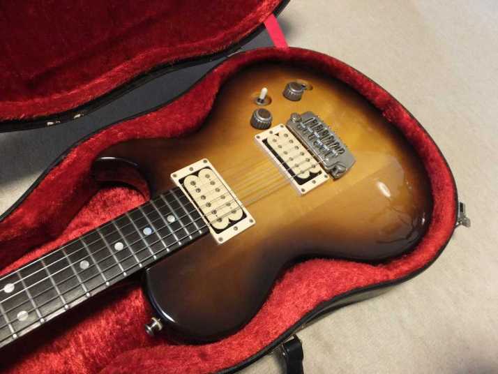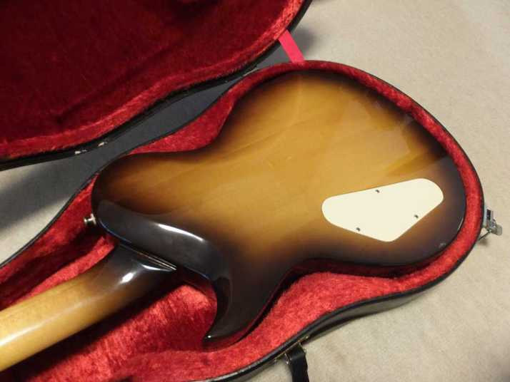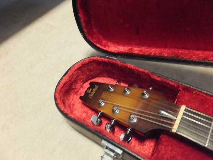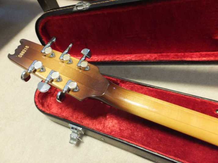 | Aria Pro II PE-600 This is probably made in 1978. There were PE-1500, PE-1000, PE-800 and PE-600 as mass production. The first PE was made in 1976 as Proto type Line. I have several PE guitars. However, I like this design better than R80. The tailpiece and Bridge are same unit. I don't like the tail piece of R80, because the string are dropped often when I change the strings. This is much easier than later model. The tone of PE series are targeted like Les Pual and Strat Mixed, I've heard. Well, PE is solid body. So, I could expect much clean high tone. However, when I played this guitar (another PE-800 also), I realized it is pretty good warm tone. It is not loudly, like good Jazz guitar. Don't know reason why this body shows like this sound. The specifications are (refer Aria ProII Catalog) : Body - Binding - Ivory Top - Carved Arch Chestnut Back - Contoured Neck - 3 Ply Maple Fingerboard - Rosewood Machinehead - MG-55C Pickup - Protomatic - IV The condition is great as 30 years old guitar. There are not many dents and scratches. You could see them on the photos. The metal parts are bit rusted, but still look not so bad. The neck and frets are fine. The simple electric circuits are well too. It is cool, isn't it? The guitar will be delivered with Aria Original PE hardcase. This hard case also give you good vintage guitar feeling! |