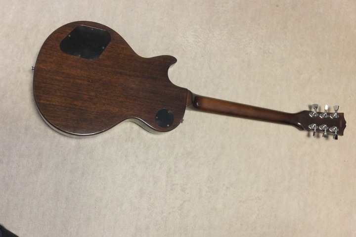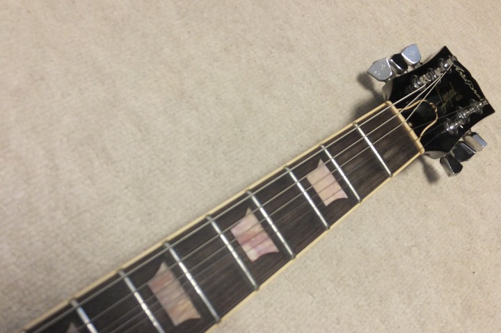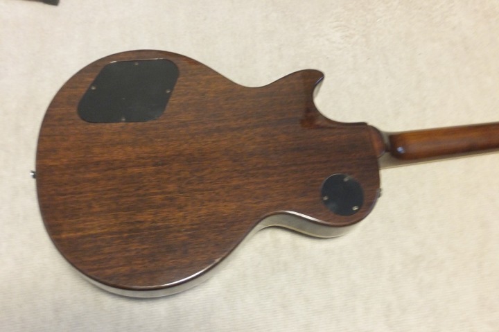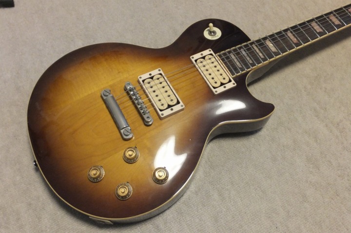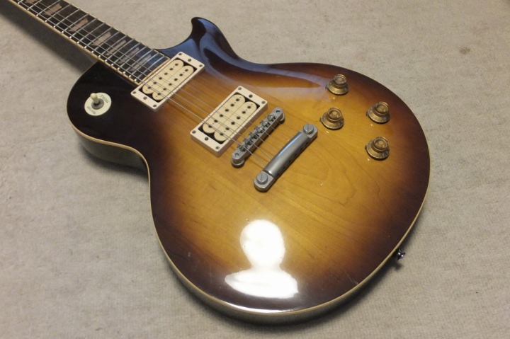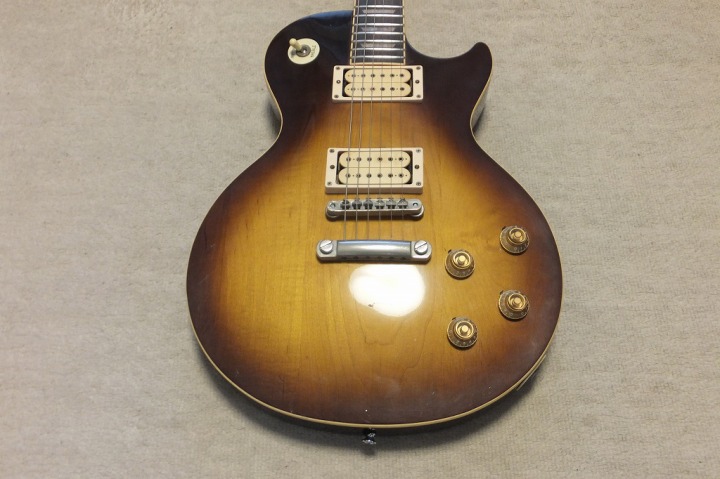 | Aria Pro II LS-500 1981 Mstsumoku made Les Paul STD It is Matsumoku made Aria Les Paul. The condition is good as over 30 years old guitar. It should be LS-500, The neck is deep joint type (with screw). This is Matsumoku construction. The top is like Maple, I guess. The body is and 2-3P mahogany. It is 5.35 Kg weight, pretty heavy. The neck is thin type with 43.35 mm nut width . It is straight. Truss Rod is adjustable. Frets are proper condition. The pickups are Dimardio Super Distortion. I felt the output of bridge pick up is slightly low compare with neck. We have changed the PU mount rings. These were cracked. I didn't change any beside this. The tuning Key are not really Aria made. It has star marking. I think it is Greco guitars. I'm not sure whether the tuner is original or not It is very good tone, you can enjoy this old Les Paul guitar!!! Well, let's try this Aria Guitar. It is over 30 years old body!!! |