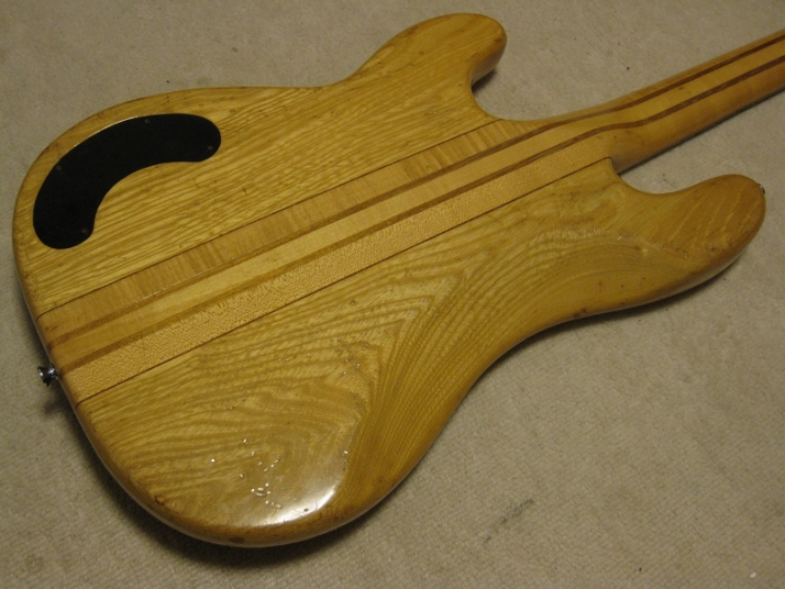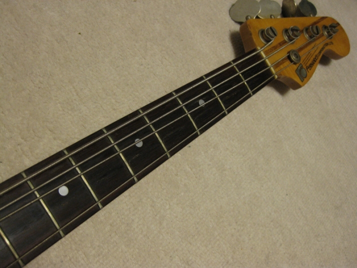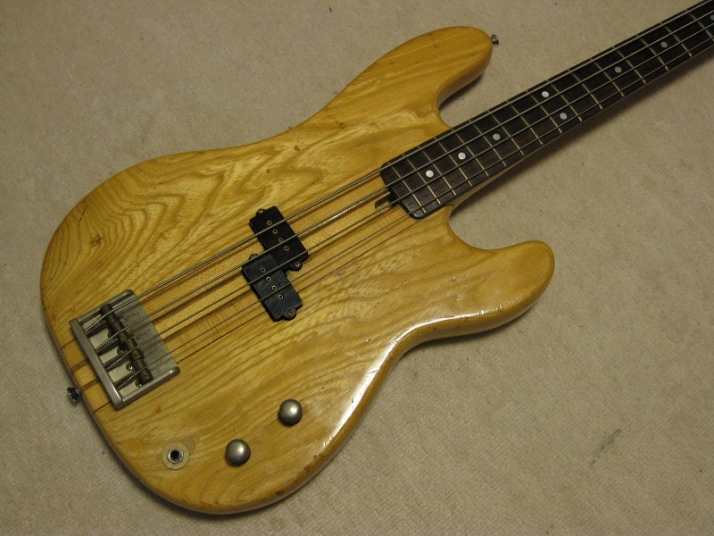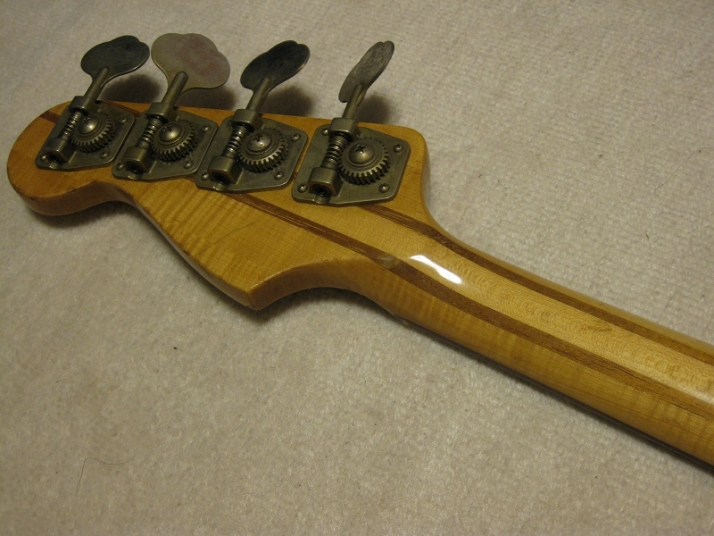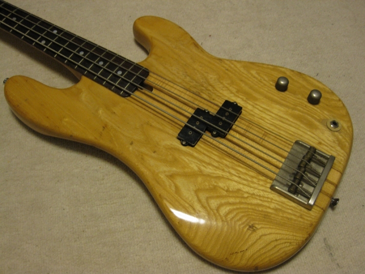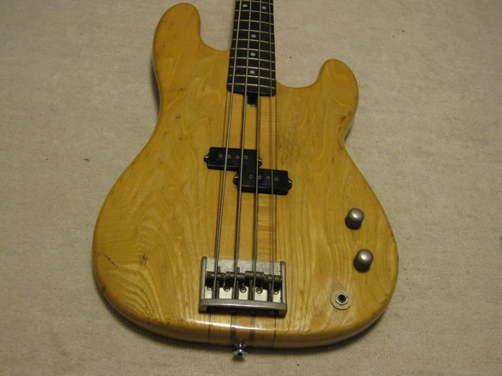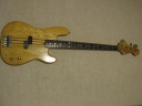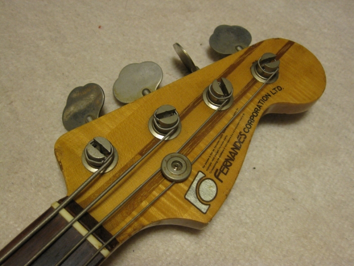 | Fernandes Bomber Bass Through Neck original Early 80's Made Fernandes made several though neck model early 80's. Absolutely, these guitars and basses were influenced by Alembic model. I have collected this model. I still keep same bass but it has been re-painting... Anyway, this bass outlook is not really good. Many dents and scratches on the body. But These are not visible because of natural color. The sound, well, pretty powerful bass tone as Bomber name. The output jack hole was damaged. The previous owner put the metal washer on. The metal parts are bit rusted, however, it is O.K. for functionally. The neck is though type. Standard C grip like with 41.1mm but width. The though neck offer you pretty smooth fingering at high frets area. The Body is Sen (Japanese Ash). The weight is 3.89Kg. Well, it is good tone bass! We are going to ship this bass with used Soft Carrying case. Well, enjoy JV bass ! |