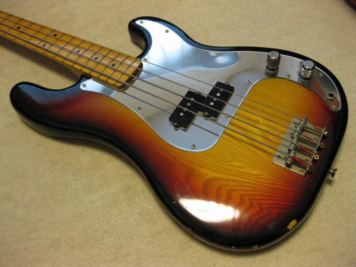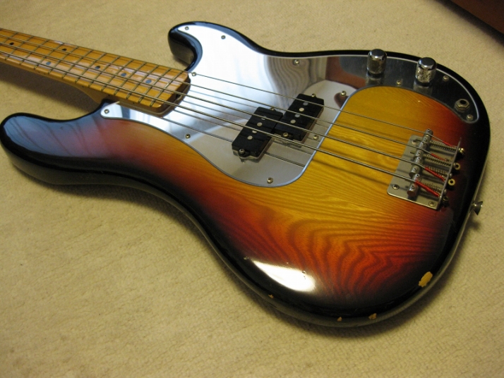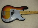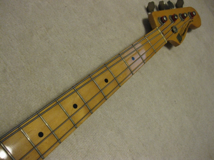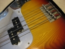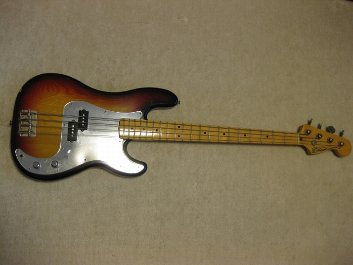 | Fernandes Precision Bass Late 70's Tokai Made This is good condition Tokai made Fernandes Precision bass. As You may know, this logo type bass was made only for 2-3 years. After this series, Fernandes started Revival series. The neck, frets and electric circuits are all proper condition. The neck is straight and frets are proper condition ( a bit worn). You could adjust it by truss rod. The nut width is 42mm. The body is probably Sen 3P with 3.55 Kg weight. It is standard weight of precision bass. The electric circuits are probably original, I didn't check it only. No Modifications and repairing by myself. There are several visible dents. But it is not really bad looking.The pickguard is maybe not original. I never seen the mirror type from Fernandes catalog. That's all, I rated - on "MINT". The bridge, metal tuner knobs are a bit rusted as vintage looks. Well, it is good tone bass! We are going to ship this bass with used Soft Carrying case. Well, enjoy JV bass ! |