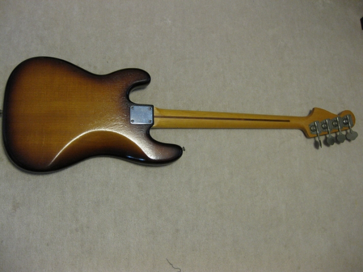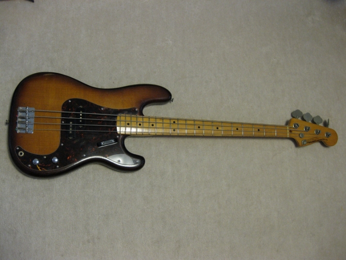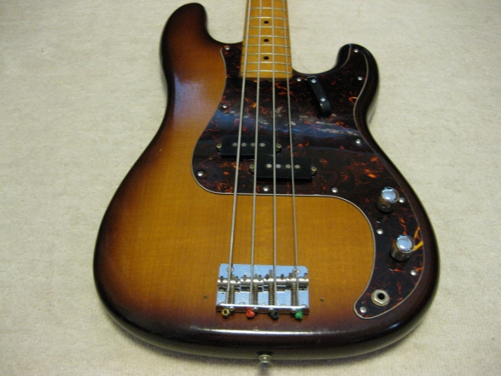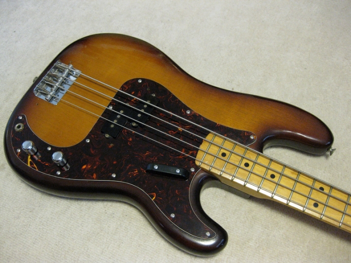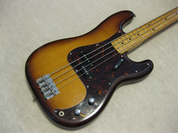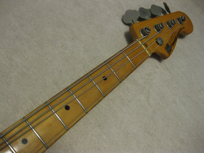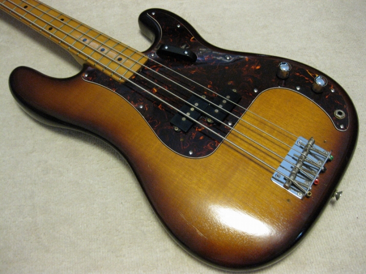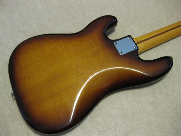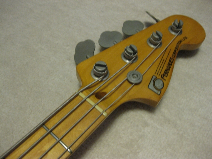 | Fernandes 1978-79 Tokai made P Bass This is Tokai made P bass. The finish is violin Sunburst. It is rare model here. Most of Bass we could get are FPB-50. This is an upper class model. The finish is very thin compare with Polyurethane staff. The body is silverheart 3-4P. It is very heavy body 4.23 Kg. The Fernandes 75 catalog said this is best wood. The neck is straight, frets and electric circuits are all proper condition. The nut width is 42.8 mm, the grip is like Standard C. Truss Rod is adjustable. The knobs were changed the current replica type, I think. We will ship this bass with used Gigbag. Well, it is good tone bass! |