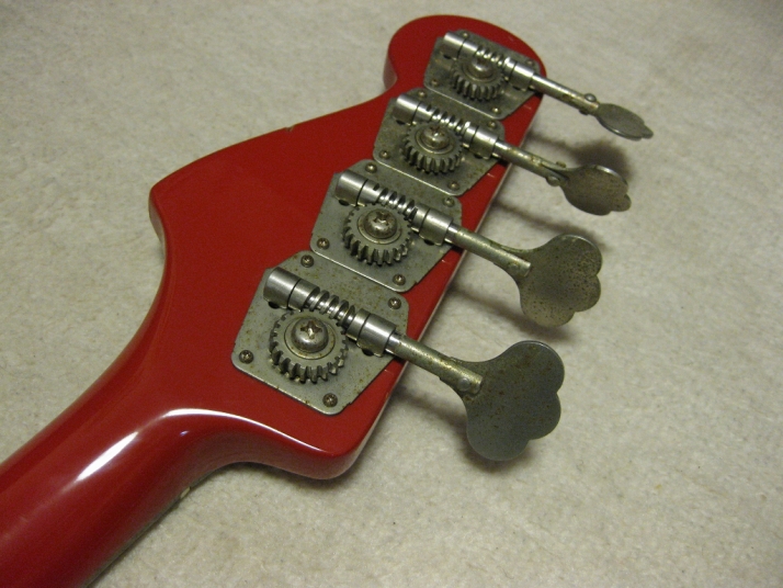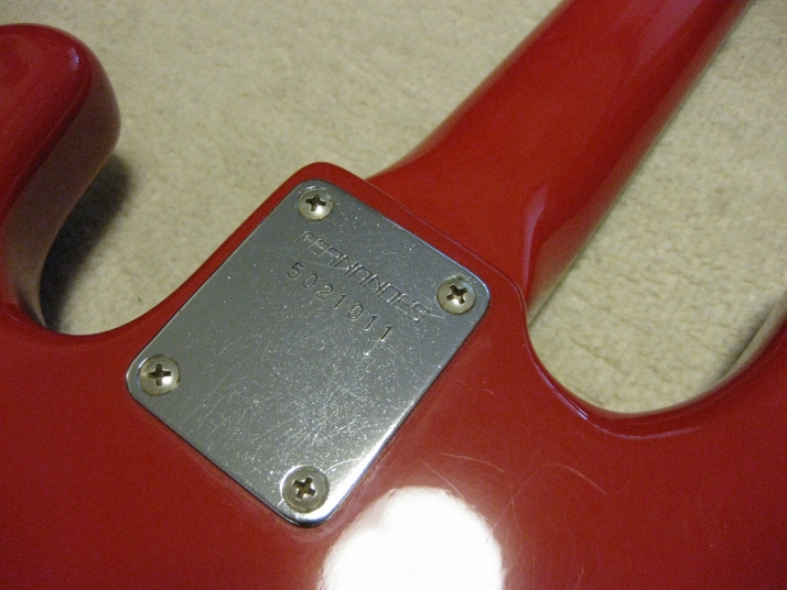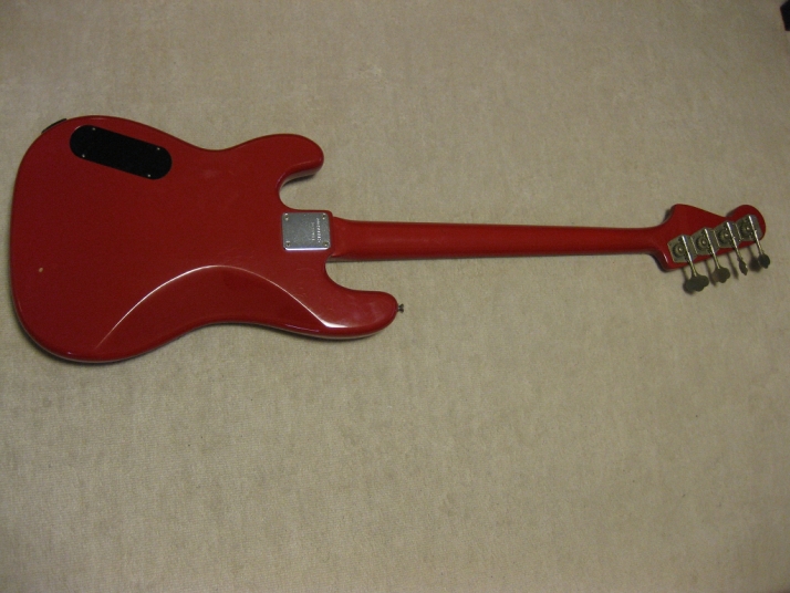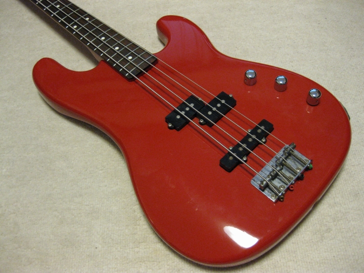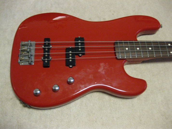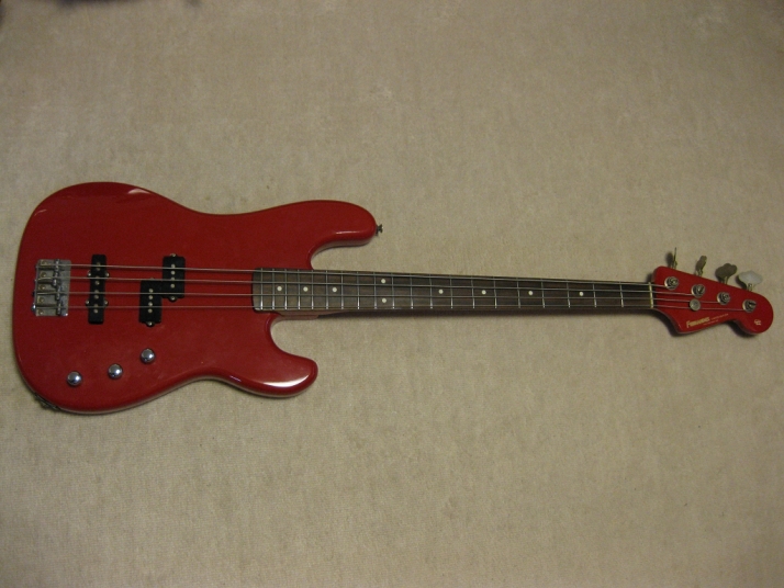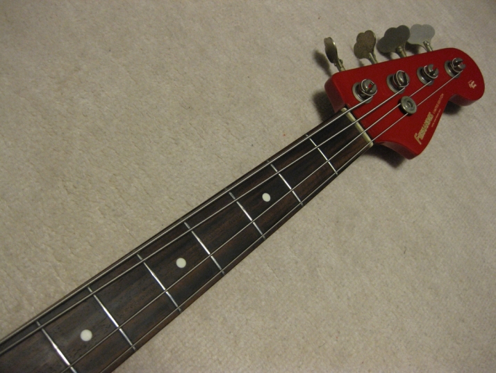| Fernandes 85 made PJ Bass I have handle this bass series several units. I don't know why the Japanese users didn't pay attention so much. Many poeple like te replica of old Fender, even it is poor material in use. Actually, this is a good bass for 1st step of JV bass. The outlook is fine. We can't see serial scratches and dents. The body should be alder 3-4P with 4.2 Kg, the neck is maple 1P with Rose. The neck nut width 40.45mm, more like Precision bass a bit slim. The neck grip is like C. The quality of 80's Fernandes was stable as leading manufacturer. So, this bass ca be base of modification or just use as current condition. I have changed the 3 Potentiometers, Output Jack, switchcraft and 3 knobs. The weak point of PJ bass is the balance of PU output. Most of case, Split PB PU is bigger than JB PU. How to mix it! It is a key of PJ style bass. Of course, the current sound is good. I like it! We are going to ship this bass with used Soft Carrying case. Well, enjoy JV bass ! |