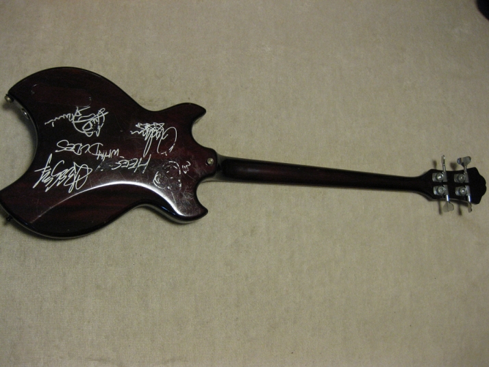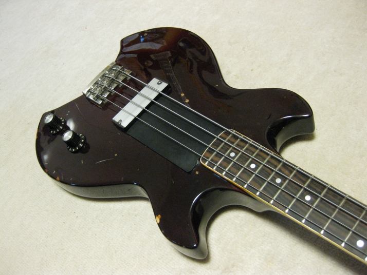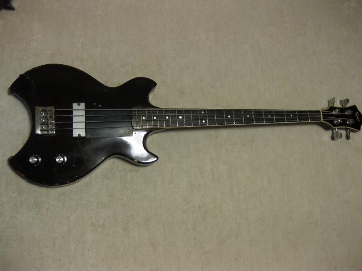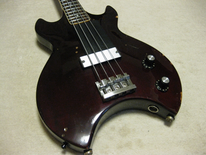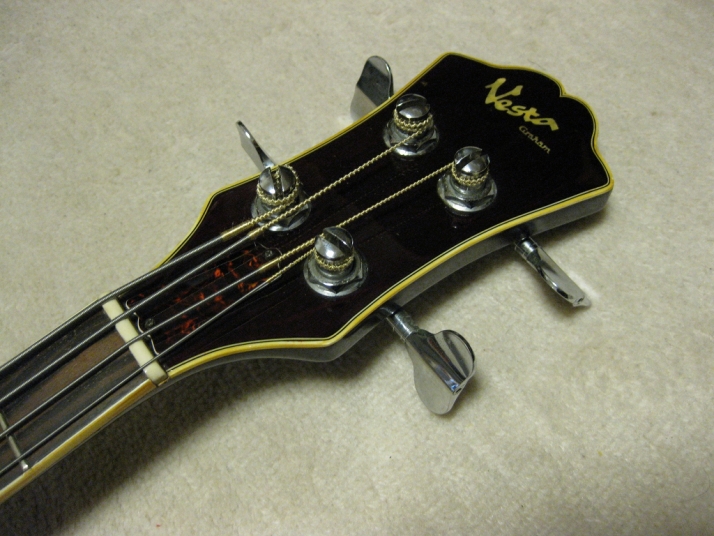 | Vesta Graham Bass PB-2500 This is my first Vesta Graham bass. Maybe, you may know, Vesta Graham was distributed by Teihatu, but designed by Shiino Musical Instruments. Well, you remember it, Vesta Graham is next generation of H.S. Anderson guitars... Actually, most famous Vesta Graham is electric semi-acoustic guitars like ES-335. They also offer the Les Paul designed semi-hollow body too. These are still very good value in Japan. Vesta Graham was made by Terada Gakki. I'm not sure this very heavy bass was made by Terada or not. The collectors here called this bass as Kingyo (Golden Fish) bass. It looks like. I don't have any specification of this bass. It just heavy bass (5.15Kg) . but it is incredible easy to play. It is set up very low action. The nut width is 41.2...grip like PJ bass. The sound is pretty soulful tone. Maybe maho body and neck with Rose finger board. The neck is set in. Only one PU...very funny looks. But very good sound. The finger rest (?) is installed between neck and pick up. I don't know this is original or not. I like this bass. Maybe I would keep this bass as my collection, But I put here. I hope many people just have a look for this unique designed bass |