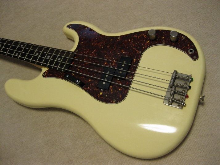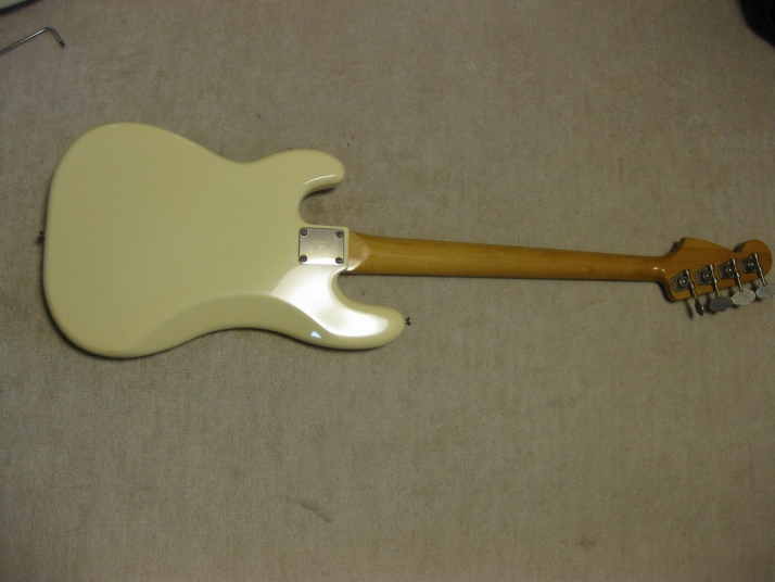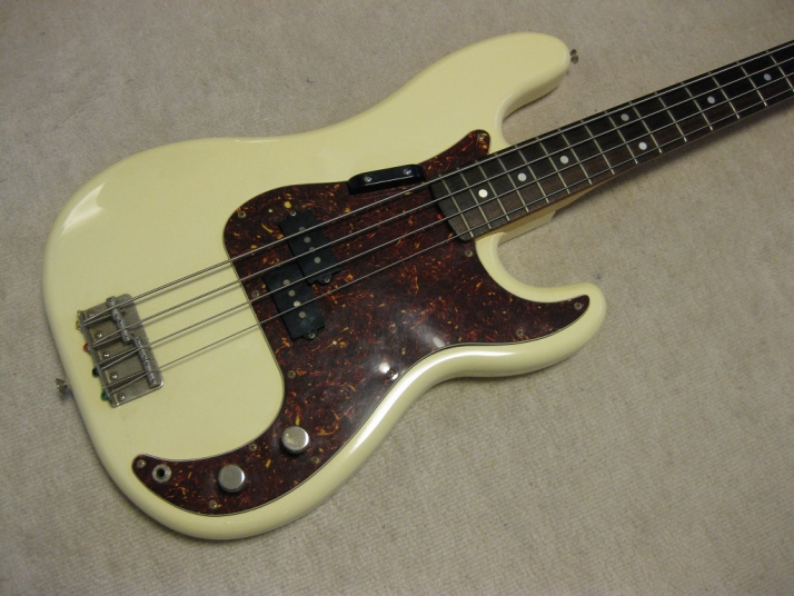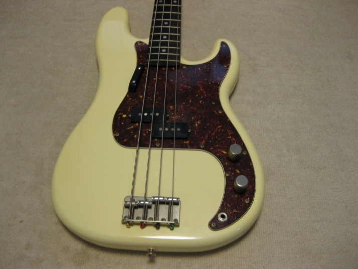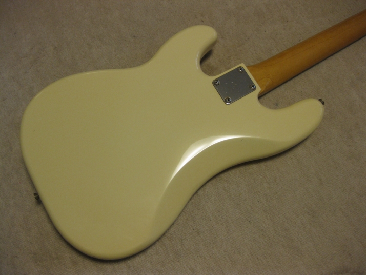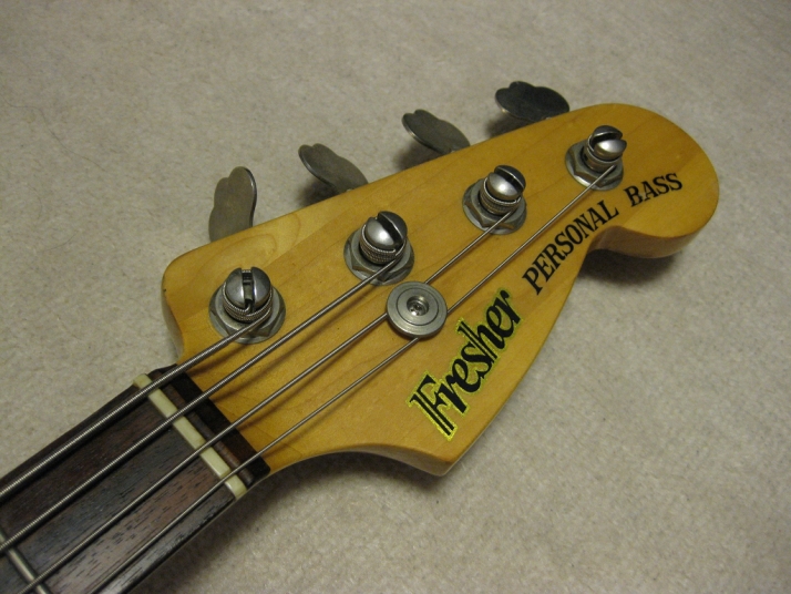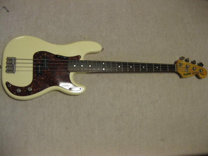 | Fresher FP-360 Precision Bass (Chushin Gakki Made) I personally like Fresher guitar and bass. Well, these were not expensive range instruments. However, Kyowa tried to reduce the cost and offered lower price than Greco, Fernandes and Tokai products. Early days Fresher were not good replica. But like this bass, this is 4th Generation, it became a good replica. Wall, the Chushin Gakki started better quality manufacturing. The construction of this bass is pretty good except the pickgurad. This pick guard is a bit curved by aging (shrinking). Well, that's all. The neck is straight, Truss rod is working and the fret are proper (almost no worn). The maple 1P but only head 3P bonding. The nut width is 42.2 mm I'm not sure the body material. It should be Sen 3-4P body think about the other Fresher guitars. This is not Ply wood, It is solid body, anyway, Well, this bass is not really high grade staff. But it is pretty good condition. If you are looking for the JV bass entry model, this is it. We will ship this bass with Gig bag. I offer this bass with proper pricing ! |