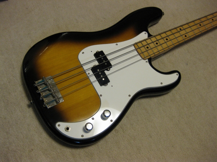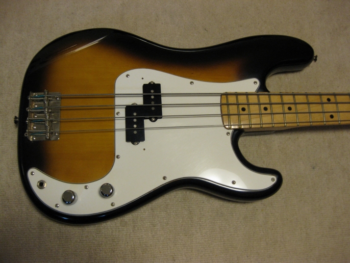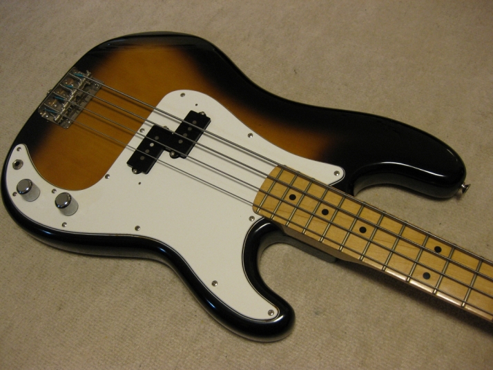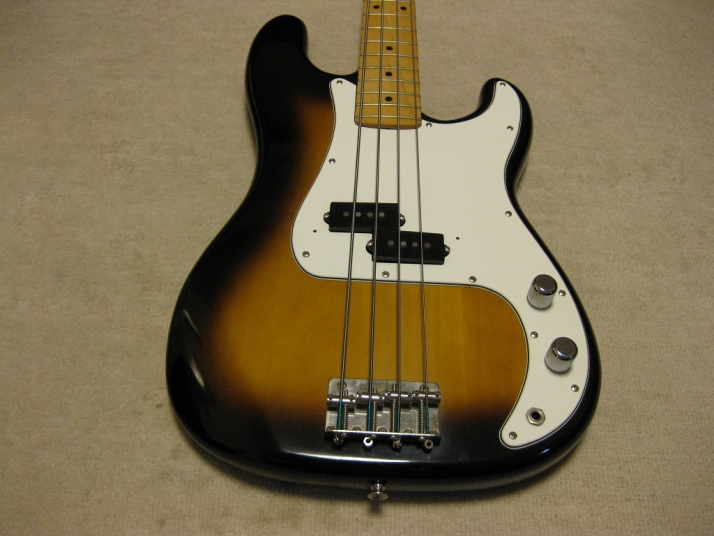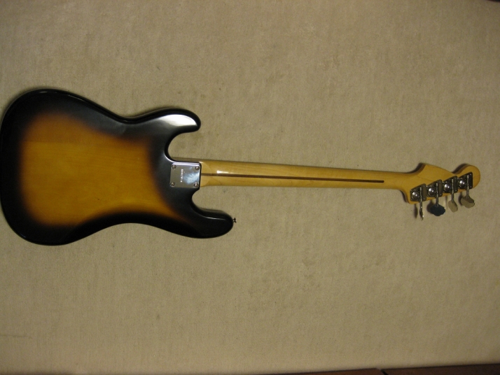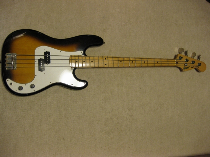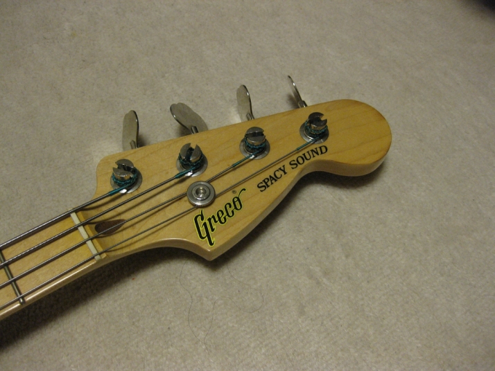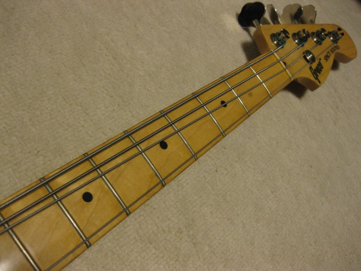 | Greco Fujigen Made Precision Bass PB-500 1980 made Good condition Fujigen made Precision bass. The production year is closed to Fender Japan JV time. This is pretty good condition with original condition. The body looks like Alder...But Greco used the Sen this time I'm not sure why but the body weight is 3.62Kg. It is very light weight as precision bass. The neck and body balance is O.K. with strap. I have checked it. The neck is maple 1P. Straight, of course. The frets are proper, not really worn. The body condition is good too. There are very little dents and scratches. The electric circuits are fine. It is original condition. I feel it is a bit heavy when turn the potentiometers. However, it is still O.K., I didn't change them to keep the original condition. The metal parts are good condition as 30 year old bass. I would say mint condition bass. We will ship this bass with Gig bag. The hard case is shown on picture is not included . This should be good bass for JV lover. Well, enjoy JV bass ! |