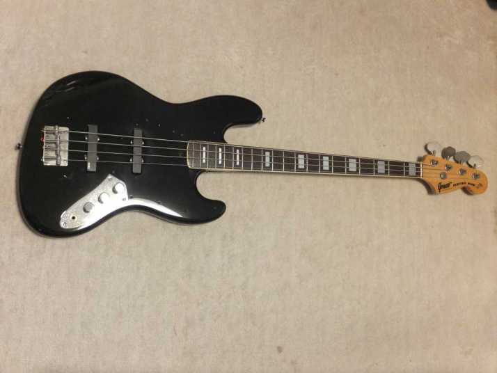 | Greco Jazz Bass JB-500 Rose Finger Board 1977 Fujigen Made This is good condition Greco Jazz bass. When we receive this bass from the seller, the body paint was peel off and painted by owner. It was terrible condition. I sent the body for our paint sub-constructor (they are a top class professional company and doing the paint works for Fujigen, Sugi and etc...). I asked them to paint the black which is original color of this bass. The body is Sen (Japanese Ash) 3P with 4.79Kg weight. The neck is Maple 1P RFB with 41.1 mm nut width. Typical JB neck shape. The neck is straight and no twisting. The frets are proper condition. The PU was changed to EMG active/ The battery is installed under control plate. The body is of course like brand new. The neck is original condition. It is very regret, the neck head has small screw hole. I guess the previous owner put the dead spot killer on the head. It is not really visible. But please note it. Pick Guard is original, but the previous owner painted. I didn't set up this pick guard yet. If you like to pout, please put it on by yourself. We are going to ship this bass with used Gigbag. Well, enjoy JV bass ! |