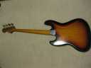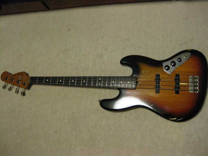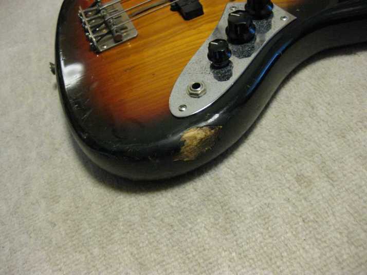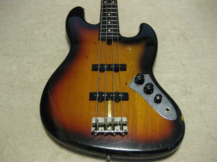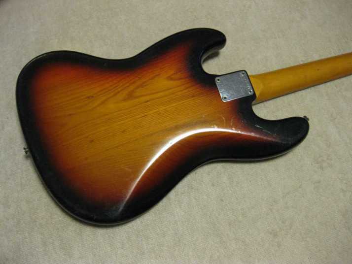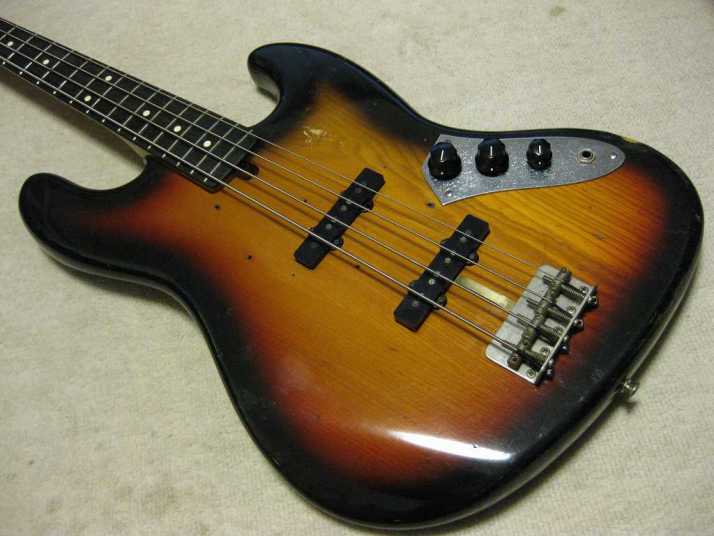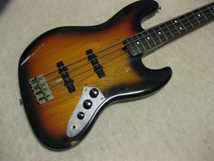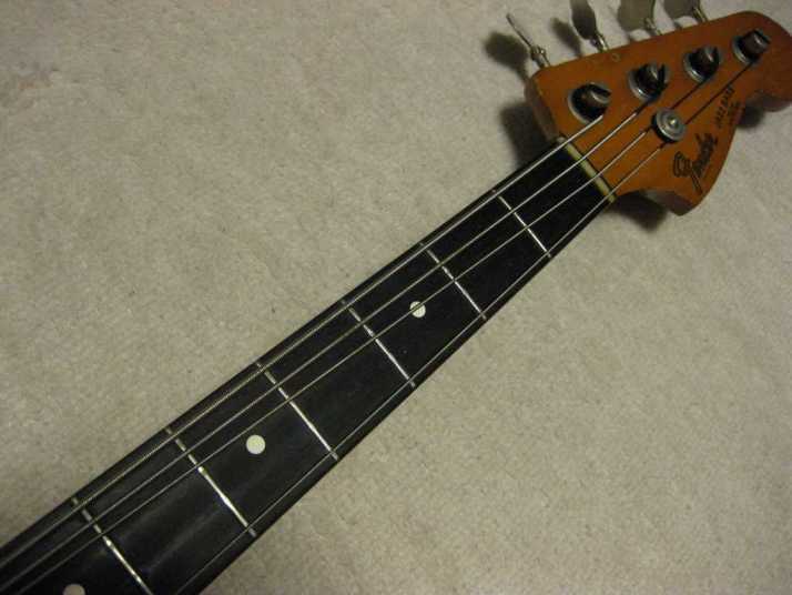 | Fender Japan JB62 Model JV Serial I'm not sure this bass is fully original JV serial bass or not. I got it as JV serial bass from the seller. However, after checking the detailed, I found several points. 1) The neck end hasn't got the production data written by pencil. It looks somebody polish the neck end and got a bit black spraying. On the other hand, we could see "made in Japan" under Fender logo on the peg head. It seems to be very early made (JV time) Fujigen made. 2) Body should be alder, but it hasn't got the stamp, Well, sometimes, they forget to stamp it, so it is not issue, but the on the neck pocket side, small paper was sticked. It said "Fender". I know the Fender USA made (replacement) body has it. 3) Neck joint hole was re-holes (only bottom directions). Somebody made them for adjusting hole position. I could not ask previous owner detailed. However, I felt this is not complete original JV serial bass. The parts are pretty much like original. Tuner is reversed type. The bridge saddle is spiral type. The PUs wires and circuit were changed to vintage type. These wiring is not original. Well, neck plate has the JV serial stamp. It looks not really great. What I mean not like brand new. It looks like vintage type. There are many scratches and dents. But these made more vintage looks. The pick guard was took off. The tone is pretty good like real vintage JB, I like. Well, please note above. I could offer this bass lower price than original JV. The gig bag (not original) will be sent when delivering. |