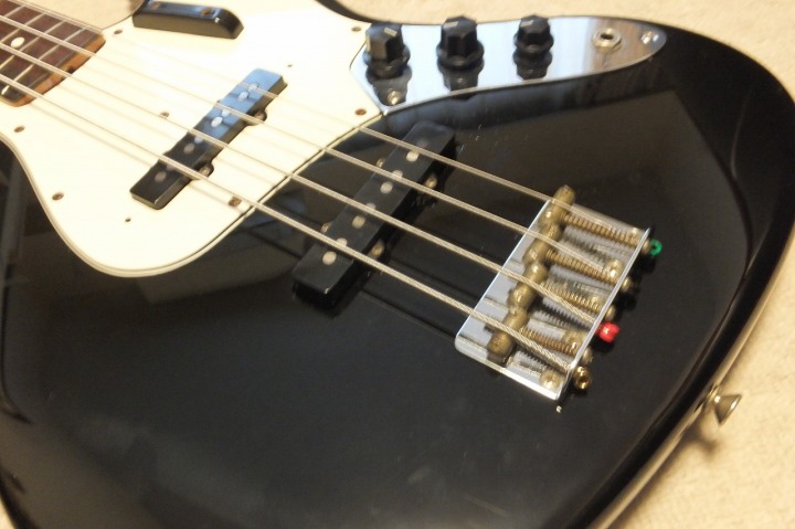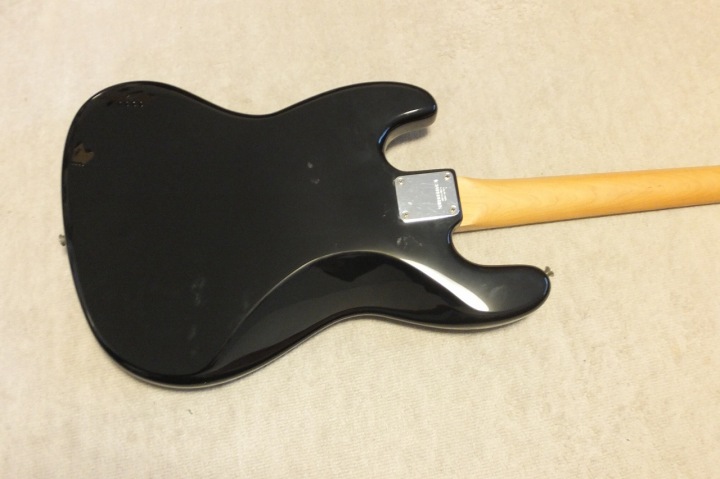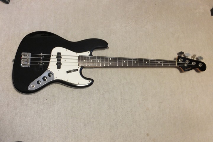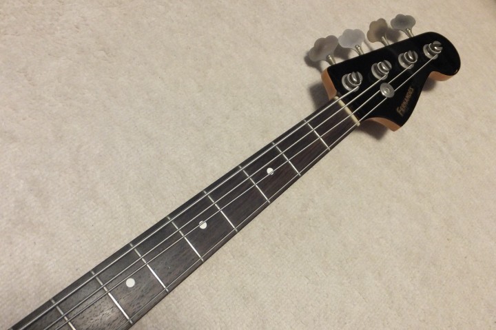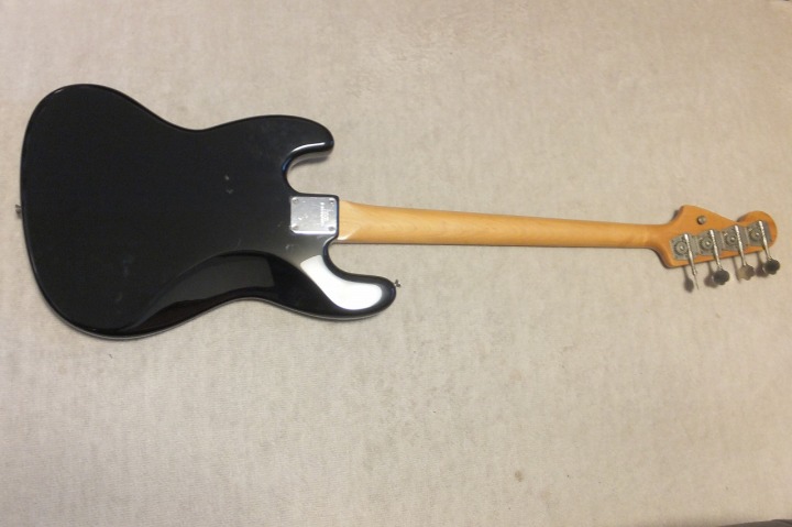 | Fernandes Jazz Bass Revival Series Early 90's made This is fair condition 90's made Fernandes Jazz bass. As You may know, Fernandes re-start the revival series early 90's. The difference between early revival and later revival is Logo mark. Later model Logo mark is under top coat paint. So, it is not easy to remove the logo mark. Early model has the removal Logo. So, many player took off the logo mark. When I got this bass, I found out that the previous user changed the neck who a while. Because he made screw holes with narrow pitch. I thought he put older neck for a while, then, put the original neck later. So, I repaired the neck holes. The body paint was so bad condition. So, I asked the our sub-constructor to repaint it completely. So, generally, the paint is good. (Yes, a bit scratches at our shop). The neck is straight not twisting. The truss rod is adjustable. The nut width is approx 38.4 mm. The body is probably Ash 3P with 4.22 Kg weight. The frets are proper condition (bit worn). The electric circuits should be original but I re-solder them a bit when I checked. We going to ship this bass with the used Gig bag. Well, enjoy JV bass |