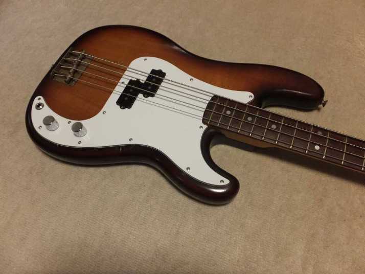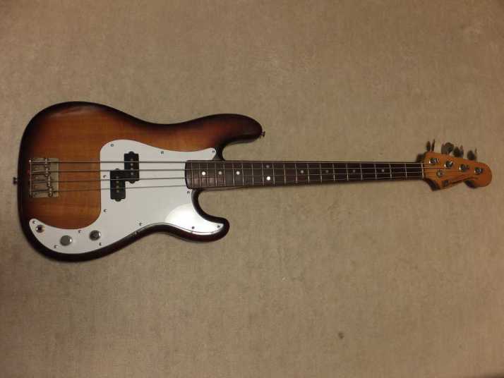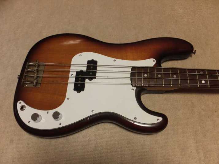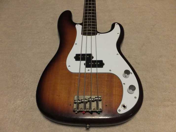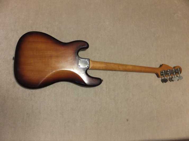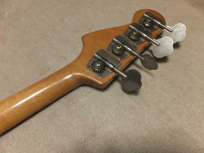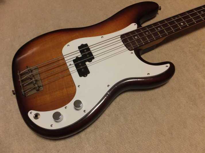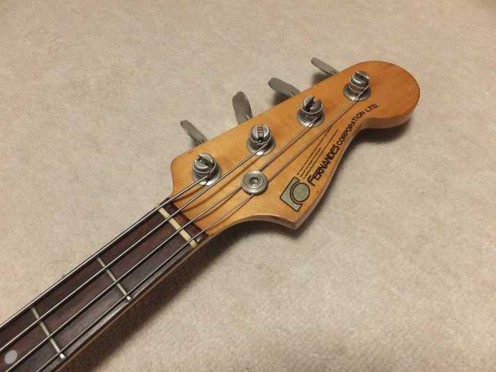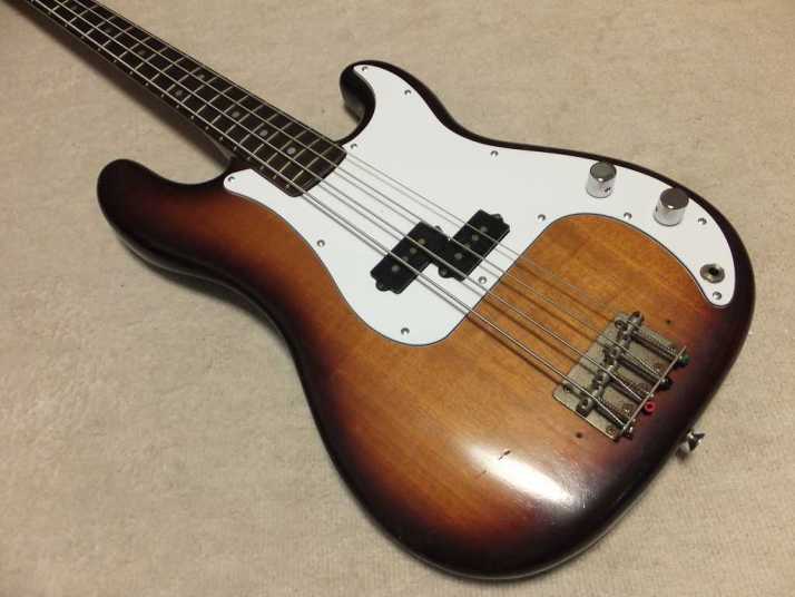 | Fernandes Precision Bass Late 1978 Tokai Made This is early 1978 Tokai made Fernandes Precision bass. It should be FPB-70 VBS from the body finish and body material. When I got this bass, the original pick guard was cut. Only control area had a panel cut from pick guard. I put the white pick guard. The neck is straight not twisting. The truss rod is adjustable. The nut width is approx 42.4 mm. The body is probably Silver heart as Fernandes described on their catalog. It should be 3P with 4.27 Kg weight. The frets are proper condition (bit worn) The PU is Fernandes Original. I have replaced the pot (new Gotohl) and Jack (Switchcraft). There are several dents and scratches. Metal parts are bit rusted. (Knobs were changed to new one). As this product year, it is still proper condition. We going to ship this bass with the used Gig bag. Well, enjoy JV bass ! |