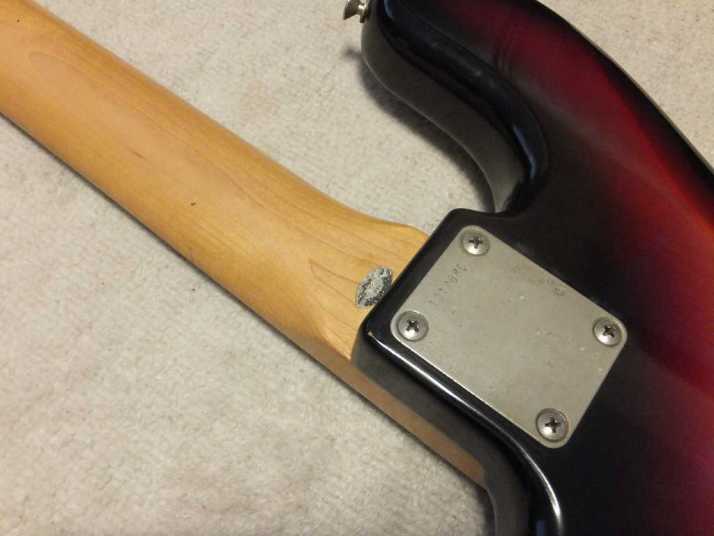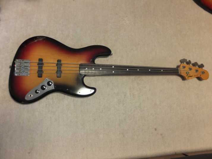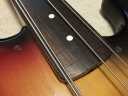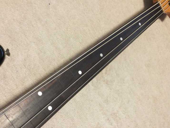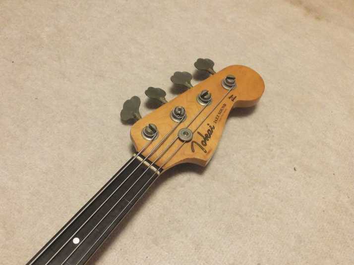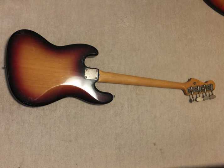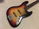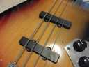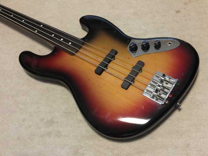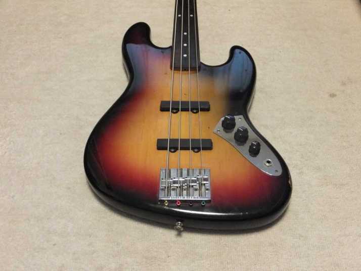 | Tokai JAZZ Bass made in 1978-80 with EMS pickups (Active) Fretless modified. It is fair condition 1978-80 made Tokai Jazz bass. I don't purchase modified guitars, but this modification is fine for Tokai bass. 2 PUs are replaced with EMG. These are active PU. The battery is located under control plate. The fretless modification was done very well. I guess it made by professional repair people. The brdge is also changed to Badass. It is good, I like. The neck is fine, the truss rod is workable. The nut width is 38.8 mm. The body material should be Sen (Japanese Ash) 2-3p, a bit heavy weight (4.2Kg). Generally good condition bass. I found the a bit crack on finger board around 18-20 fret center. It would not be trouble. If you really feel bad for this, I recommend you to put small amount of bond with Rose wood powder. It is should be O.K. Nothing special beside this. The sound, it is good JB tone. No Noise and more sustain, I felt. If you will play the good melody, this bass shows you very good tone! We are going to ship this bass with used Gigbag. Please try JV JAZZ Bass! |