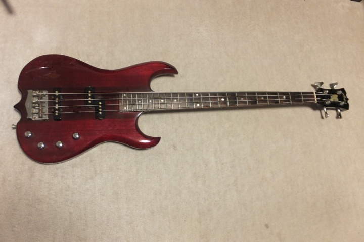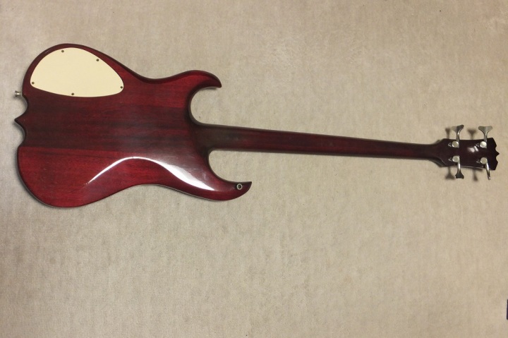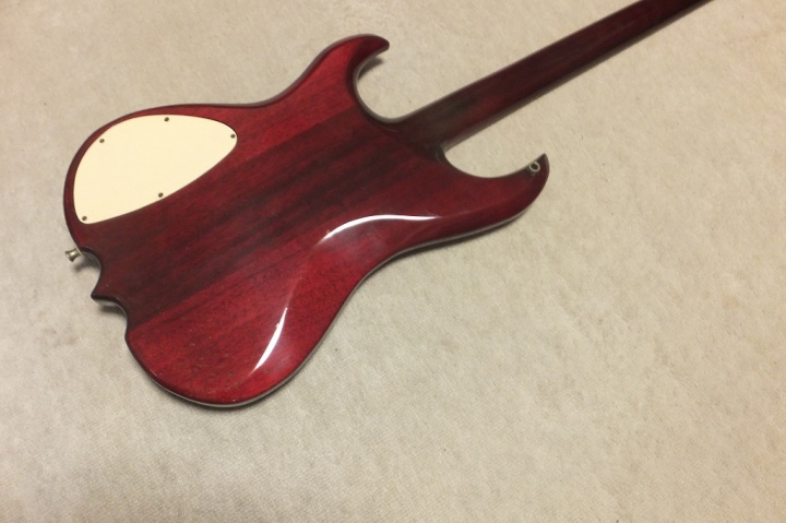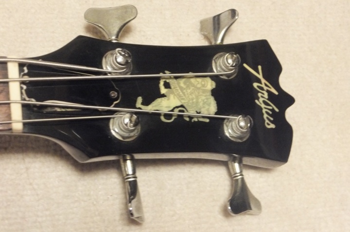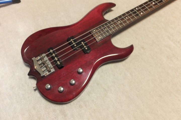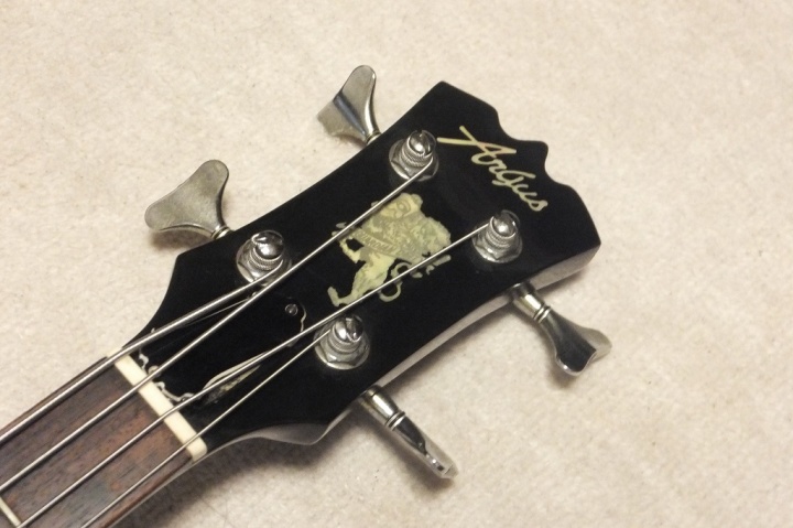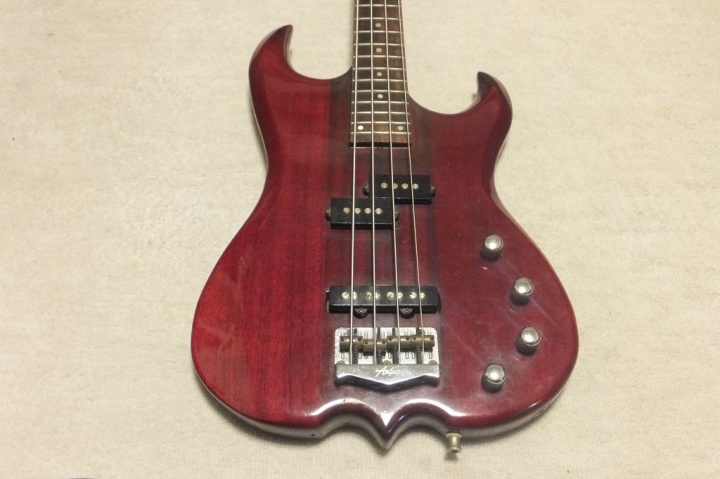 | Argus Original Designed Bass (Maybe Kurukumo made/Shiino Designed) This is Argus brand original designed bass. Argus brand was distributed by Kyowa Shokai (domestic whole seller, bankrupted 1-2 years ago). Kyowa distributed Fresher, Camel and Argus. Argus was top quality range series. Kyowa asked Mr. Hidesato Shiino to produce and address this brand guitars and basses. So, early Argus guitars were very good quality. Specially, their semi-Acoustic guitars were still used by many professional musicians even now. This bass maybe built early 80's. I'm not sue Mr. Shiino involved this bass design, but could feel a bit influence from his design. Maho body and 1P though neck. Yes, it is not really heavy tone. Feel like SG bass tone, but still a bit Fender taste. I think this construction and material are suitable for fretless bass. It is about 3.5Kg, pretty light weight. The neck is 41 mm width nut. Of course, straight now. I have checked the truss rod. It is fine to adjust. This is Maho neck. So, I think you had better carefully adjust when you change the heavy gauge on this basee. The paint has a bit clouded. But think about the age, it is still proper condition. If you are looking for the original tone, this 30 years old bass is suitable for you. Look pretty good too! We will ship this bass with Gigbag (not original) |