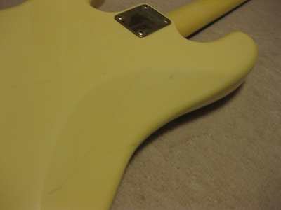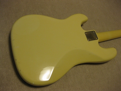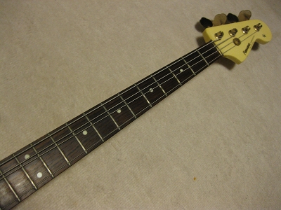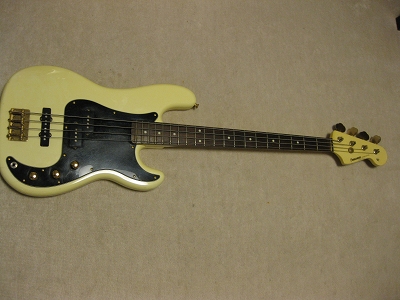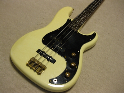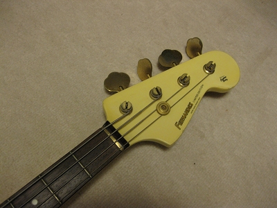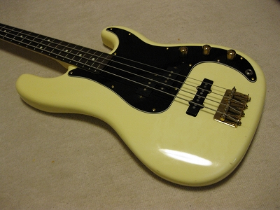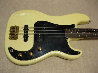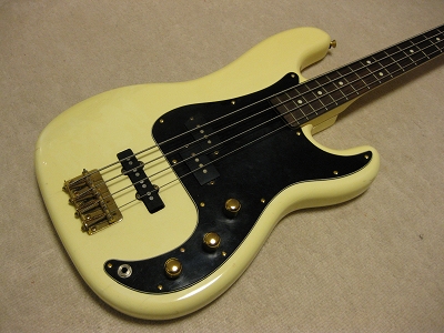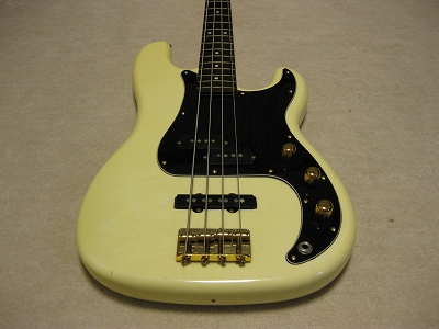 | Fernandes PJ Bass '80 made This bass should be made in 1984 from the serial number. The body color is white (well, like white Pearl) with gold metal parts. When I got it, the parts are too rusted. Therefore, I have changed the following parts. 1) Gold Metal Knob 2) Gold Strap Pin 3) Bridge Plate took from other Fernandes 4) New stainless saddle screws In addition, I have changed some to the new potentiometers (MIJ), Switch craft Out put jack and Capacitor (Orange Drop). Also, I felt the output balance between P type PU and J type PU was not really good. I changed the PU to Lindy Fralin Jazz Bass (from my stock, Brand New). The out put of original Fernandes P PU is pretty bid over 10K Ohm. J type is around 6-7K Ohm, so, it is still not same output even I changed. However, when I added the output of J PU, the sound is changed, it could be used as one of tone. (I like it) The neck is fine. I have adjusted the truss rod. It is still adjustable. The nut width is 41 mm. The frets are proper condition. The body. I'm not sure the material, but it should be Ash. The body paints were cracked many section. I thought the cracks are only paint part. The weight is 4.2Kg. We are going to ship this bass with used Gig Bag. Please try JV Precision Bass! |
